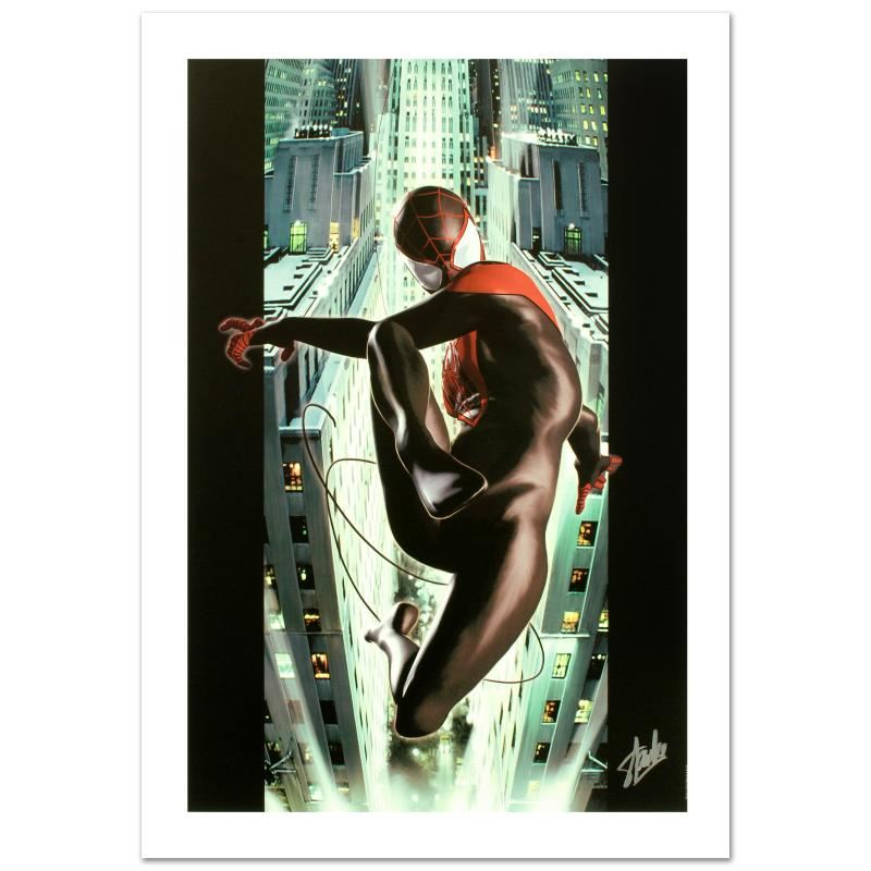 A piece of comic book history, this limited edition, from original art by Kaare Andrews, depicts Spider-Man swinging into action. Kaare Andrews is a Canadian comic book writer and artist and filmmaker known for his cover work on Incredible Hulk and many other comic books published by Marvel Comics. He was the first recipient of The Shuster Award for Outstanding Artist in 2005 for his work on Spider-Man: Doctor Octopus. He has also worked on Ultimate X-Men, Gen, The Amazing Spider-Man and The Matrix Comics. "Ultimate Spider-Man #2" is a limited edition giclee on canvas by Kaare Andrews presented by Marvel Comics, numbered and hand signed by the great Stan Lee! Includes Certificate of Authenticity! Measures approx. 18" x 27" (image).