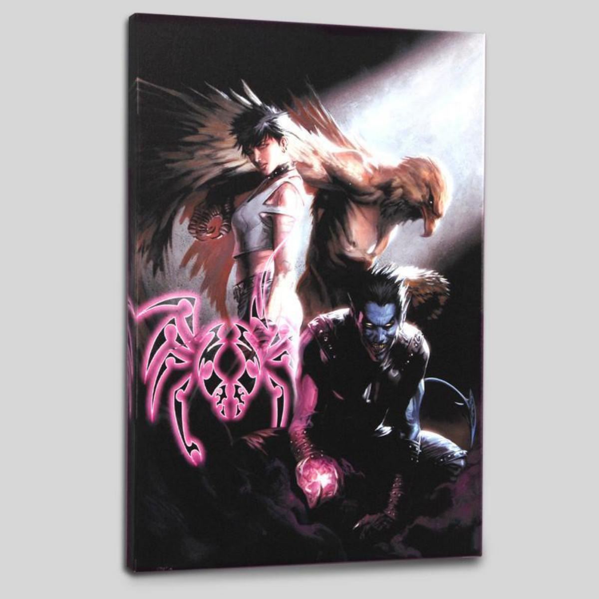 A piece of comic book history, this limited edition, from original art by Gabriele Dell'Otto, depicts an intense trio of Nightcrawler, Angel and Dazzler. In 1998 Dell'Otto started collaborating with the European division of Marvel Comics, producing covers, posters and lithographies for Italy, France and Germany. In 2002, his work was shown to the editor-in-chief of Marvel Comics, who entrusted to him with the art for the Secret War mini-series. "Ultimate X-Men #95" is a limited edition numbered giclee on canvas by Gabriele Dell'Otto presented by Marvel Comics. This piece comes gallery wrapped. Includes Certificate of Authenticity! Measures approx. 18" x 27" (image); 1.5" (depth). Reference #: 176607.