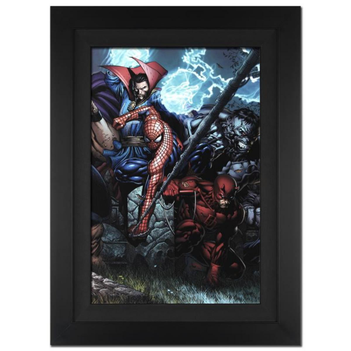 A piece of comic book history, this limited edition, from original art by David Finch, depicts several classic characters from the Marvel Universe. In 2003, Finch came to Marvel Comics for a year-long arc on Ultimate X-Men, after which he began work on The Avengers and thereafter The New Avengers. He has also worked on such titles as Captain America, Spider-Man and the Hulk. "Ultimatum #4" is an extremely limited edition giclee on canvas by David Finch presented by Marvel Comics, hand signed by the Great Stan Lee (1922-2018) and numbered out of only 10! This piece comes custom framed and ready to hang. Includes Certificate of Authenticity! Measures approx. 25" x 34" (with frame), 18" x 27" (image). Reference #: 203355.