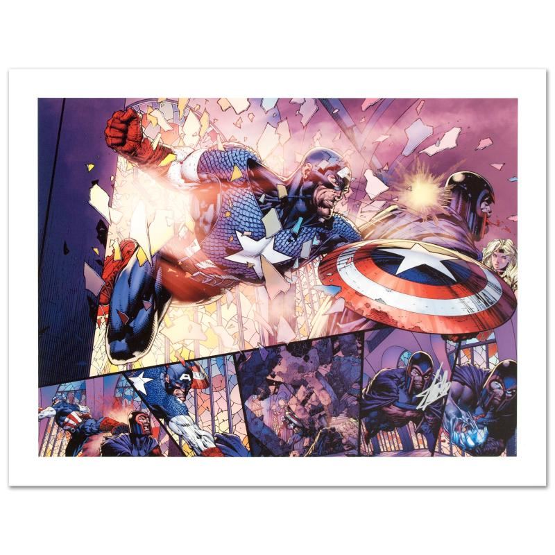 A piece of comic book history, this limited edition, from original art by David Finch, depicts an action packed scene starring Captain America. In 2003, Finch came to Marvel Comics for a year-long arc on Ultimate X-Men, after which he began work on The Avengers and thereafter The New Avengers. He has also worked on such titles as Captain America, Spider-Man and the Hulk. "Ultimatum #4" is a limited edition giclee on canvas by David Finch presented by Marvel Comics, numbered and hand signed by the great Stan Lee! Includes Certificate of Authenticity! Measures approx. 24" x 18" (image).