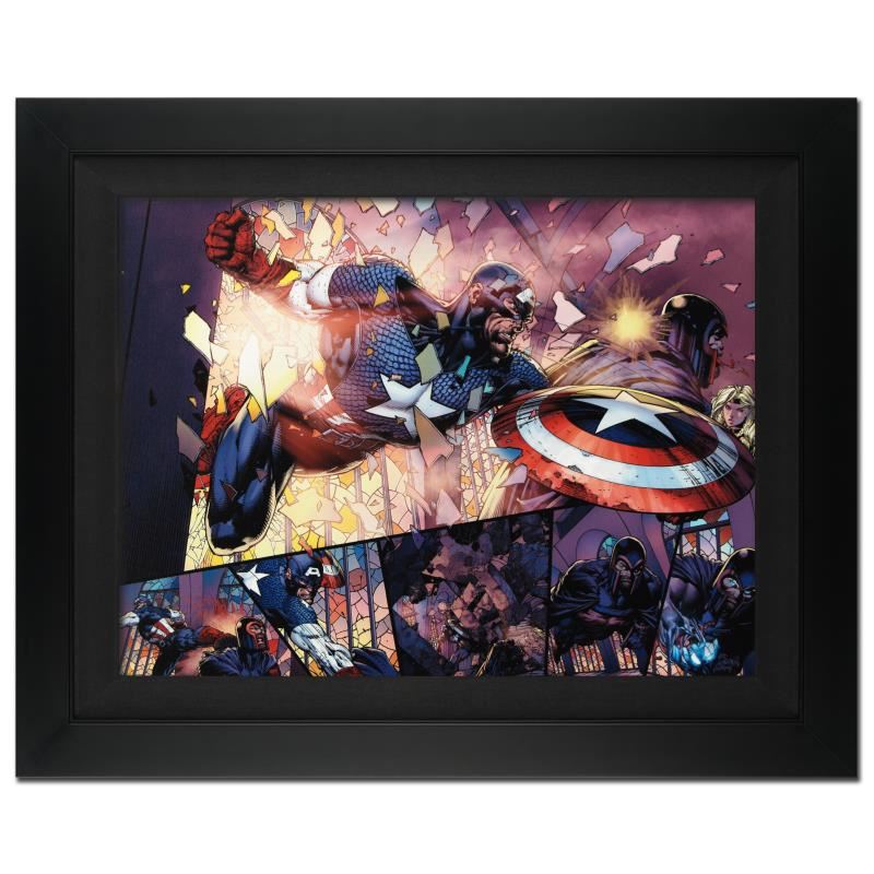 A piece of comic book history, this limited edition, from original art by David Finch, depicts an action packed scene starring Captain America. In 2003, Finch came to Marvel Comics for a year-long arc on Ultimate X-Men, after which he began work on The Avengers and thereafter The New Avengers. He has also worked on such titles as Captain America, Spider-Man and the Hulk. "Ultimatum #4" is an extremely limited edition giclee on canvas by David Finch presented by Marvel Comics, hand signed by the Great Stan Lee (1922-2018) and numbered out of only 10! This piece comes custom framed and ready to hang. Includes Certificate of Authenticity! Measures approx. 31" x 25" (with frame), 24" x 18" (image).