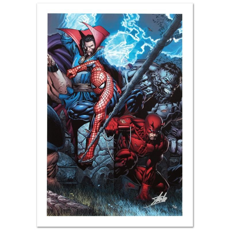 A piece of comic book history, this limited edition, from original art by David Finch, depicts several classic characters from the Marvel Universe. In 2003, Finch came to Marvel Comics for a year-long arc on Ultimate X-Men, after which he began work on The Avengers and thereafter The New Avengers. He has also worked on such titles as Captain America, Spider-Man and the Hulk. "Ultimatum #4" is a limited edition giclee on canvas by David Finch presented by Marvel Comics, numbered and hand signed by the great Stan Lee! Includes Certificate of Authenticity! Measures approx. 18" x 27" (image).