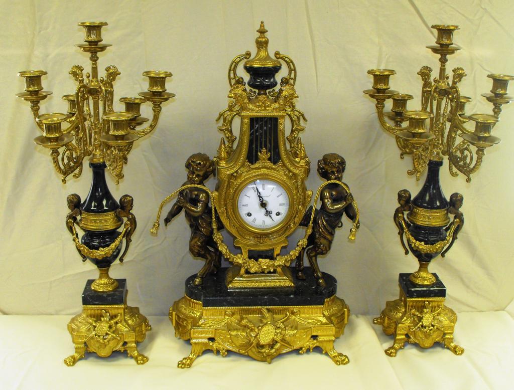 A very fine cherub figural clock set with marble inset base. 24 x 15 clock- 24 x 10 c/sticks. Brass works clocks.