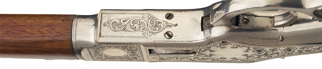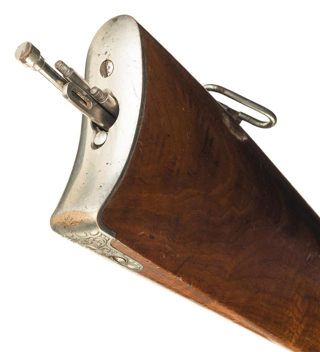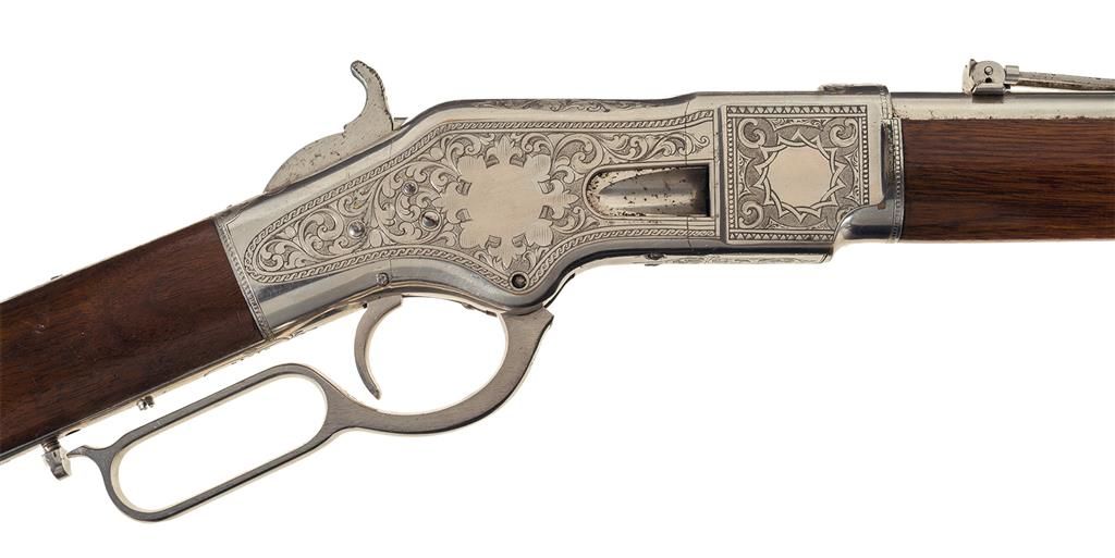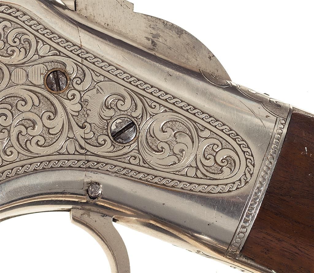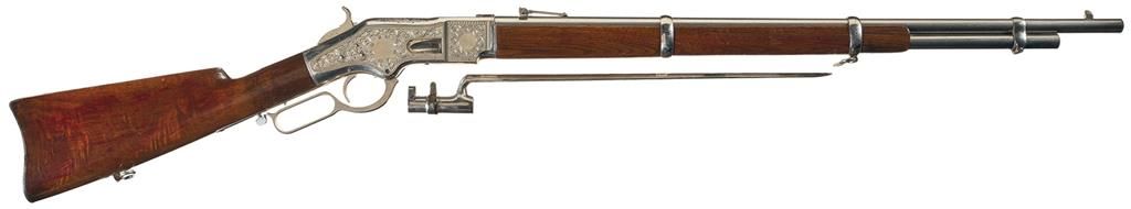 Third Model Winchester 1866 Musket manufactured in 1870 and engraved and signed by Conrad F. Ulrich. The musket has the distinctive 27-inch round barrel with 24-inch magazine and long (17-inch) forearm, three barrel bands and block-mounted front sight that serves as a lug for a socket bayonet. The barrel has a dove-tail mounted, Henry style, folding leaf rear sight with 900 yard center notch and elevator bar stop screw. Sling swivels are mounted on the middle barrel band and the stock. The upper tang is factory drilled and tapped for a rear sight. The carbine style buttplate has a sliding trapdoor. The butt trap contains a nickel-plated, four-piece, jointed steel cleaning rod. The top of the barrel is roll-stamped with the two-line legend "WINCHESTER-REPEATING-ARMS. NEWHAVEN. CT./KING'S-IMPROVEMENT-PATENTED-MARCH 29.1866. OCTOBER 16. 1860." between the lower barrel band and the rear sight. "C" is stamped on the top of the barrel just ahead of the receiver. The serial number "61216" is stamped in an engraved banner behind the trigger on the lower tang. The rifle and bayonet have a full nickel-plated finish. The stock and forearm are straight grain American walnut with a semi-gloss finish. The top sides and bottom of the receiver, cartridge elevator, upper and lower tang and buttplate heel are engraved with American style scroll work on a punch-dot background. A face is partially hidden in the scrollwork of the left side of the receiver in a style more typical of Gustave Young. Both sides of the receiver are decorated with stylish open panels and shields. The scrollwork panels are separated by elaborate engraved borders. The rifle is signed with the tiny rectangular stamp: "C.F. ULRICH" behind the trigger. Factory engraved Model 1866 Muskets are extremely rare. Ulrich signed Model 1866 Muskets are rarer still. No Ulrich signed or engraved Model 1866 Muskets are illustrated in the primary references on Winchester factory engraving "THE BOOK OF WINCHESTER ENGRAVING" by R.L. Wilson or "THE WINCHESTER BOOK" by George Madis.