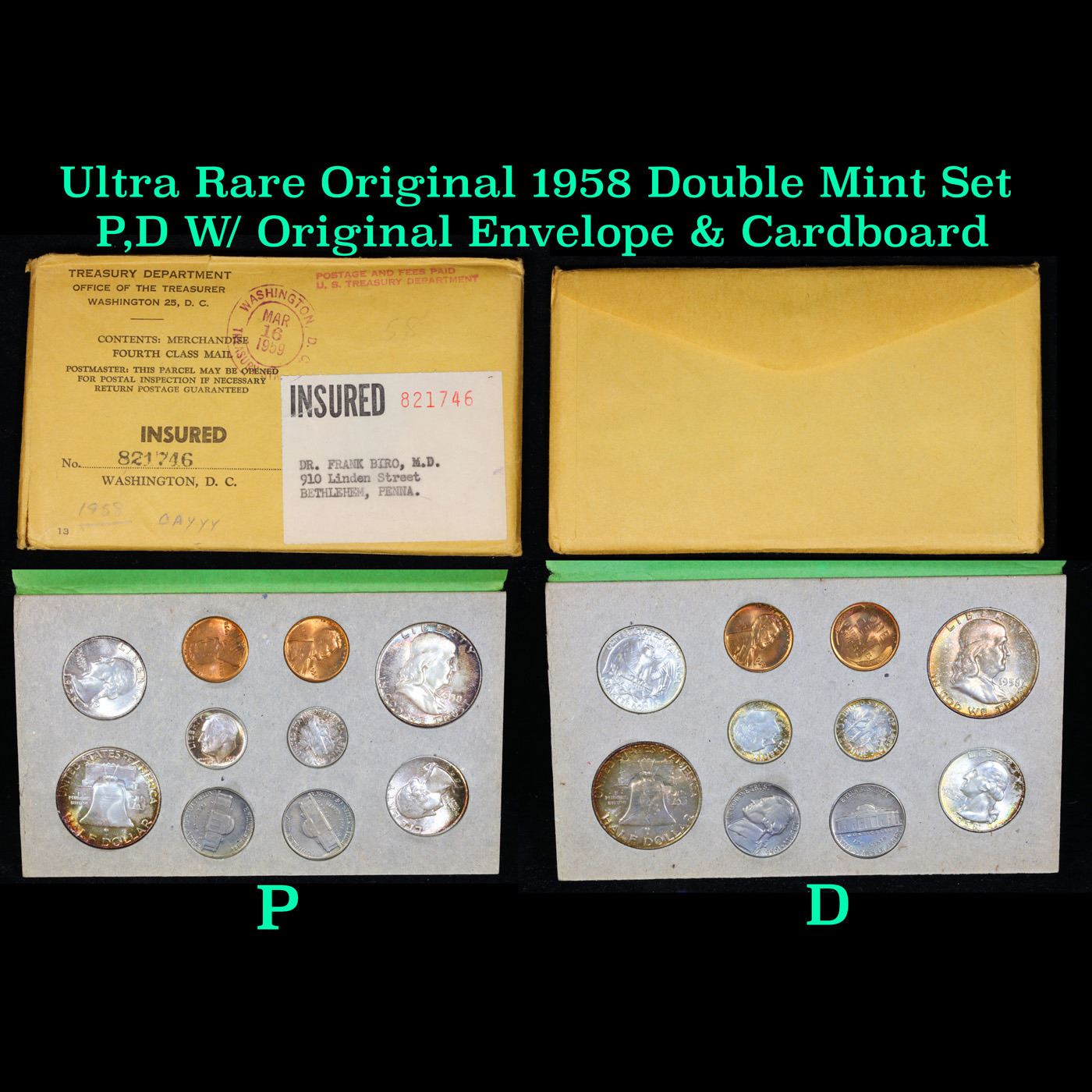 Ultra Rare Original 1958 Double Mint Set P,D, W/ Original Envelope & Cardboard. Up for Auction is an 1958 P D, Double Mint Set In original Cardboard and original Envelope! Inside is two of each type of coin. Most of the Coins are Nicely Toned, the Washington 25c D and Roosevelt 10c D Have Rainbow tone. Has Not Been Checked for FBL or FB.
