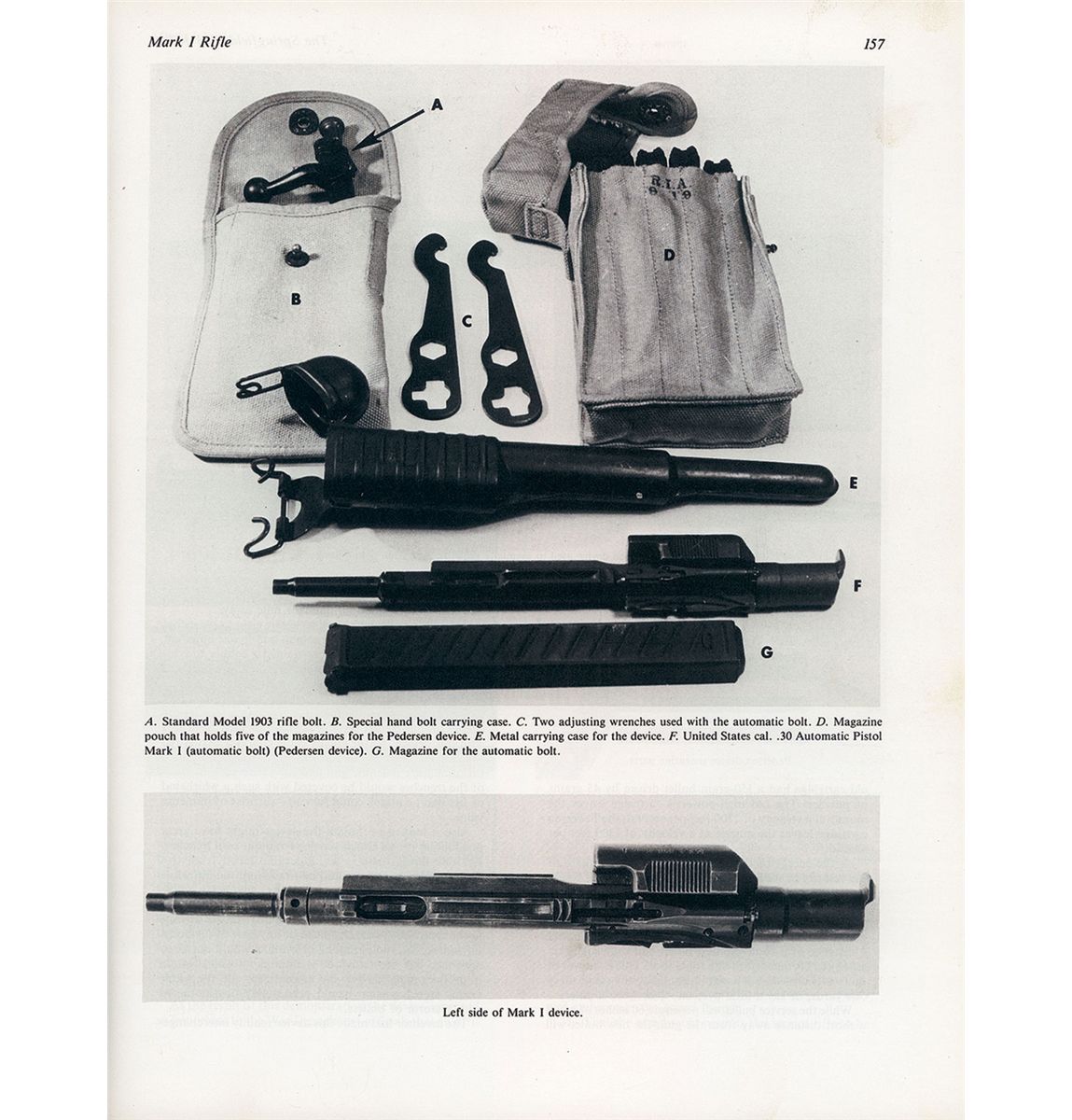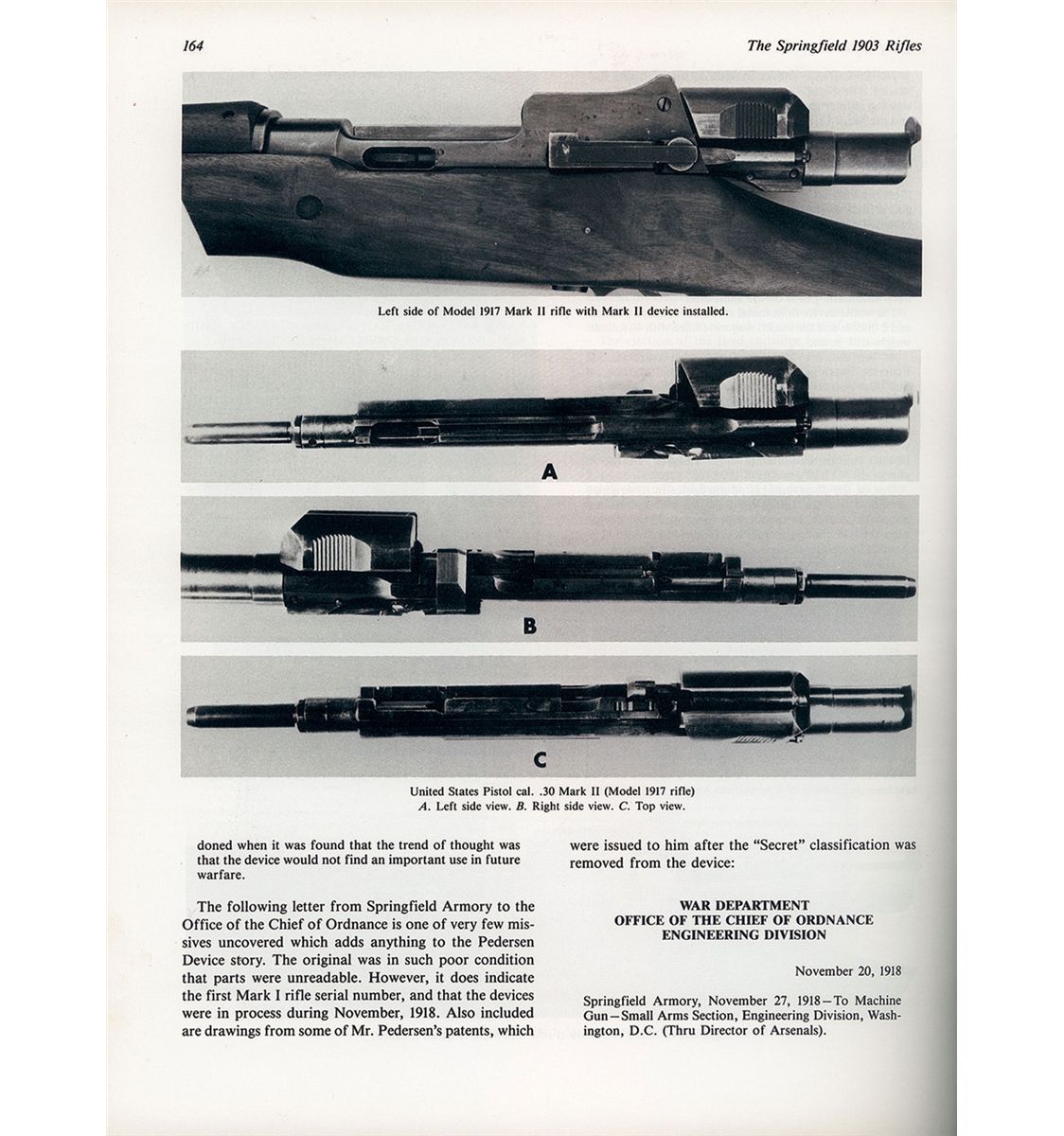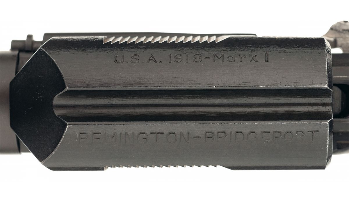 This is a beautiful example of a super rare, original "tool room sample" of the 1918 Mark I Pedersen device as intended for use on the Model 1903 Springfield rifle. These device and the Mark I rifles have always been a very scarce and highly desirable item for the 1903 Rifle collector and certainly any U.S. Martial arms rifle collector. This item and the entire concept was the brain child of J. D. Pedersen a engineer and inventor of the Remington firearms company, who is also credited with developing several innovative firearms, such as a pump action shotgun and semi-automatic pistol during this time frame. As we all know the concept was that with this device was developed to be inserted into a standard Mark I Model 1903 bolt action rifle, that would immediately convert that rifle into a semi-automatic rifle capable of sustained semi-automatic fire using the standard 40 round magazine, very innovative for 1917 when every country was still using bolt action rifles. This device was demonstrated to Gen Crozier, Chief of the U.S. Ordnance Dept and other representatives of the War Dept. in 1917. They immediately saw the technological/battle field advantage this item would mean to the US Military and immediately classified the program and all subsequent manufacture of these devices as secret well after WWI. An initial order was placed for 100,000 of these items along with the modified Mark I rifles. The production items were all manufactured by Springfield Armory and subsequently stored there until a sufficient quantity were on hand so they could all be issued at once to specific units in France. The idea was to capitalize on the technology advantage and surprise the Germans in some future engagement. However the war ended before they could be issued and all items were subsequently destroyed after WWI, making these extremely scarce and rare today, with this specific example is even more rare in that it is one of the ultra-rare Remington Arms produced "tool room" or early prototype samples that were made specifically for demonstration to the U.S. Government. These are easily identified because they were made prior to Mr. Pedersen filing for his various patents on these devices. Consequently the markings on this rare device are located on each side of the sliding bolt assembly/top cover and are "U.S.A. 1918-MARK I and REMINGTON-BRIDGEPORT", versus the later production versions that included the additional "Patent Applied" for markings and a serial number for the actual device.