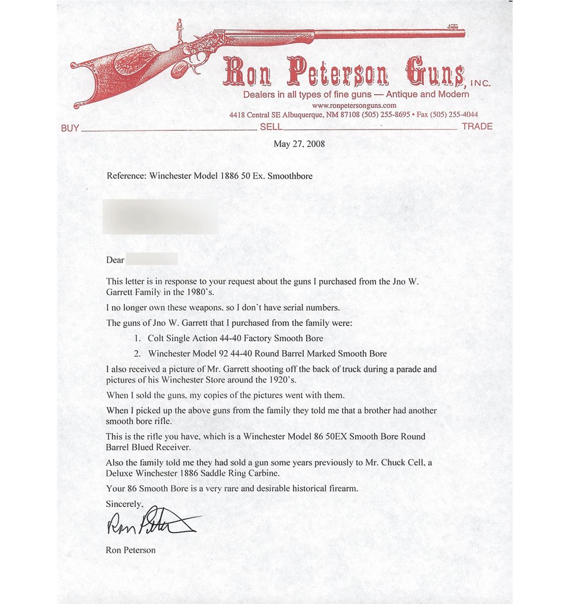 This Winchester Model 1886 Lever Rifle was manufactured in 1909. This rifle was reportedly owned by champion trap and exhibition shooter Jno W. Garrett of Colorado Springs, Colorado. In the included 2008 letter from Ron Peterson of Ron Peterson Guns, Peterson states that he purchased a smoothbore Colt Single Action and a smoothbore Model 1892 Winchester rifle from the Garrett family in the 1980s and that the extended Jno Garrett family also owned this Winchester Model 1886 smoothbore rifle (he does state that it has a round barrel, likely a typo). The documentation also includes copies of two photographs. One photograph is captioned, "JNO. W. GARRETT IN THE CIVIC STREET PARADE/SHOOTING FLYING CLAY TARGETS WITH/A MODEL 1886 WINCHESTER RIFLE" and dated August 1912 and shows Garrett with a Model 1886 rifle. The second photograph shows the window display of "JNO. W. GARRETT SPORTING GOODS" and is dated 1918. Jno W. Garrett held the world record for breaking 961 of 1000 thrown targets in four hours and three minutes. This record was eventually broken by the famous female exhibition shooter "Plinky" Topperwein. The rifle features a 26-inch full-octagon smooth bore barrel with full length magazine. The barrel has a special order dovetail mounted Winchester Express front sight with silver bead and patent date on the left side of the base and a special order Winchester Express rear sight with three folding short yardage leafs. The upper receiver tang is factory drilled and tapped. The rifle has a high polish blue finish on the barrel, magazine, forearm cap and receiver. The hammer, lever and crescent buttplate have a color casehardened finish. The stock and forearm are special order fancy grain walnut with a varnish finish. The upper left barrel flat is roll-stamped with the two-line legend "MANUFACTURED BY THE WINCHESTER REPEATING ARMS CO./NEW HAVEN. CONN. U.S.A. PAT. OCT. 14. 1884. JAN. 20. 1885" ahead of the rear sight. The caliber, "50-EX" is roll stamped on the upper left barrel flat just ahead of the receiver. The oval, "W/P" Winchester proofmark is stamped on the top of the barrel and magazine. "MODEL 1886/-WINCHESTER-/TRADE MARK REG. IN U.S. PAT. OFF." is roll-stamped in three lines on the upper tang. The 1884 and 1885 patent dates are stamped in two lines on the lower tang behind the trigger and the serial number "149906 A" is stamped behind the rear tang screw. Accompanying the rifle is a detailed hand written three page evaluation of the rifle by George Madis, author of "THE WINCHESTER BOOK". The Madis evaluation concludes, "This is one of the rarest of Winchesters and with its condition, age and rarity it will be a star in any collection or museum." On page 350 of "THE WINCHESTER BOOK" author George Madis states, "Smoothbore rifles were made to order, especially in caliber Express, but very few were made and they are therefore very rare".