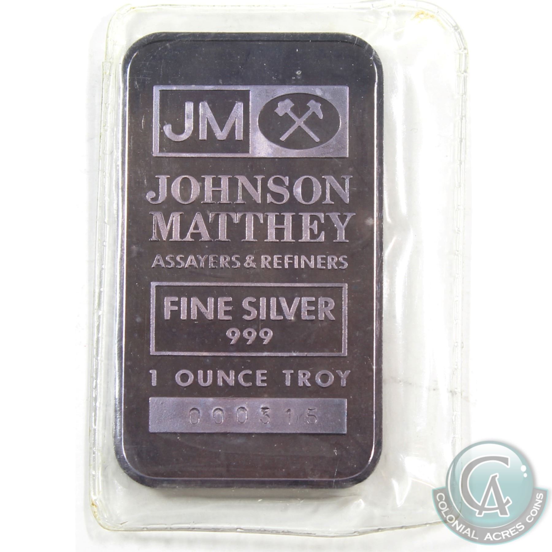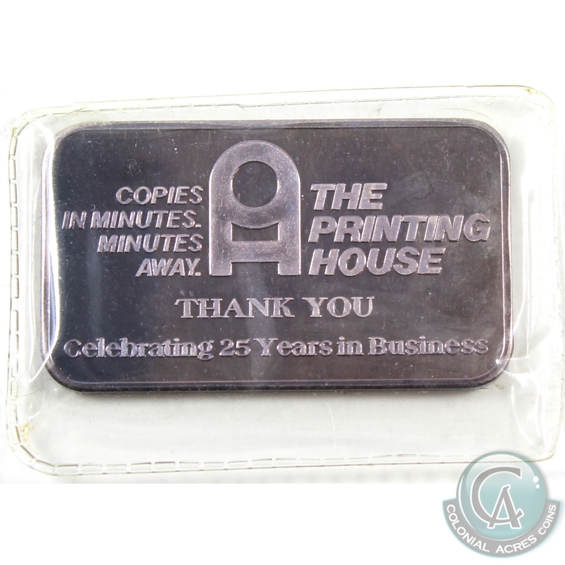 Ultra Scarce Johnson Matthey 1oz Fine Silver Promotional Bar with 'The Printing House' Reverse (TAX Exempt). Serial # 000315. Bar contains an attractive even toning.