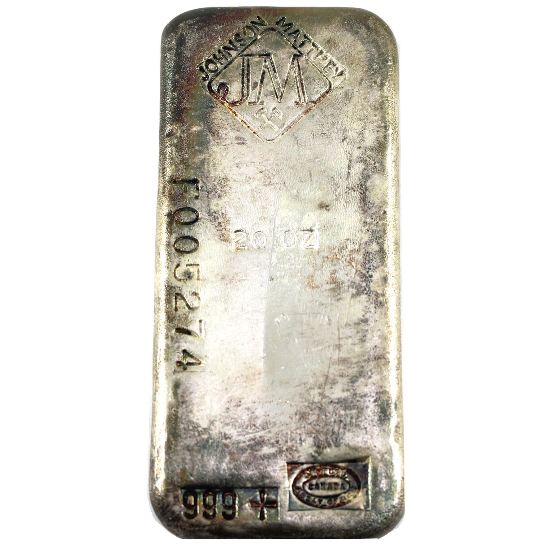 Ultra Scarce Johnson Matthey 20oz Fine Silver Bar with Reverse Stamp Anomaly (Tax Exempt). This scarce 20oz Example with Serial # F005274 contains the reverse stamping.