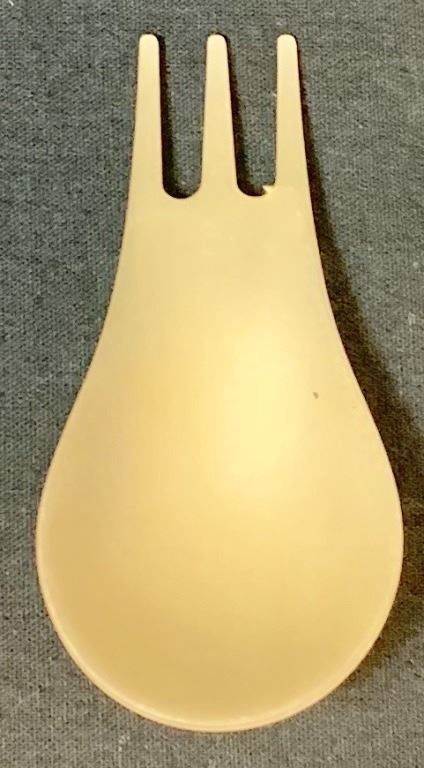Original prop spork used in the dystopian science fiction action film "Ultraviolet" (2006) where a beautiful hæmophage infected with a virus that gives her superhuman powers has to protect a boy in a futuristic world, who is thought to be carrying antigens that would destroy all hæmophages. The film stars Milla Jovovich as Violet Song, Cameron Bright as Six, and Nick Chinlund as Ferdinand Daxus.