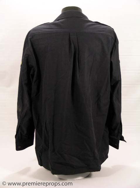 Navy Blue Police Uniform-Navy LS Shirt (size 42/ button front/ two chest pockets/ features police insignia on each shoulder), Navy Flat Front Pants (no size/ two hip pockets/ two back pockets/ zip fly/ missing knotch for waist closure/ hem on legs is held together with straight pins), Navy Police Cap (no size/ black decorative band around hat w/ dual silver star accents/ black plastic brim) (screenworn/ includes costume dept. wardrobe tag) (POLICE)