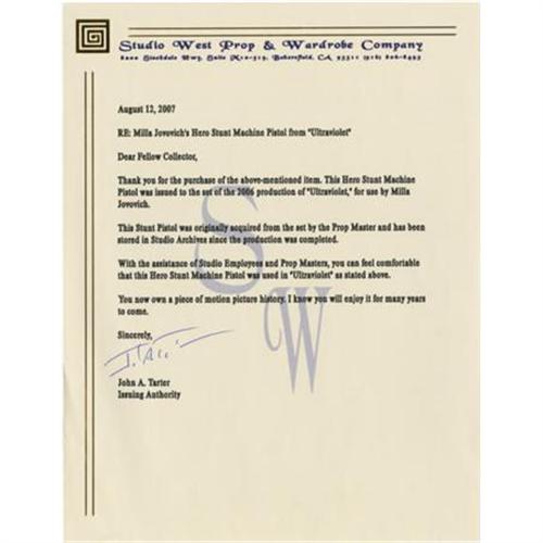 <B>"UltraViolet" Prop Pistol.</B></I> A large futuristic prop automatic pistol with working trigger action, used in the 2006 sci-fi action thriller starring Milla Jovovich. In Excellent condition. <I> Accompanied by COA from Studio West Prop and Wardrobe.</B></I><BR><BR><b>Shipping:</b> Clothing, Costumes & Jerseys (<a target="_blank" href="http://www.heritageauctions.com/common/shipping.php">view shipping information</a>)