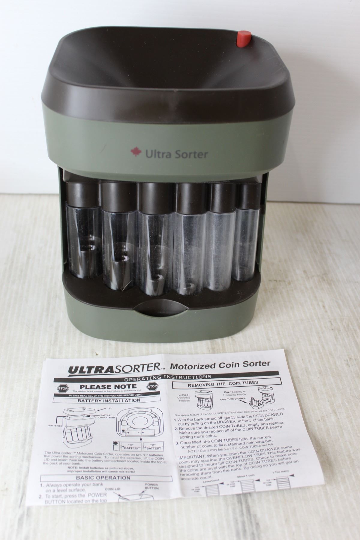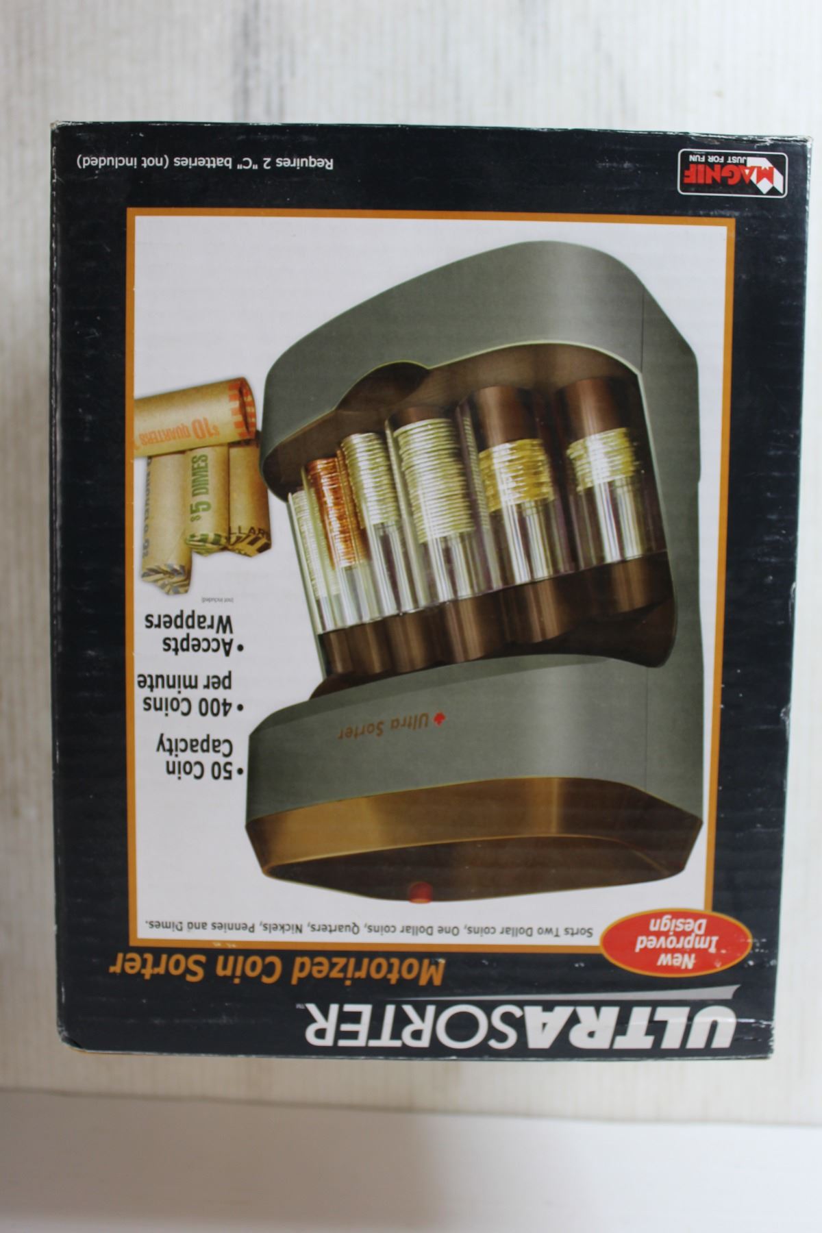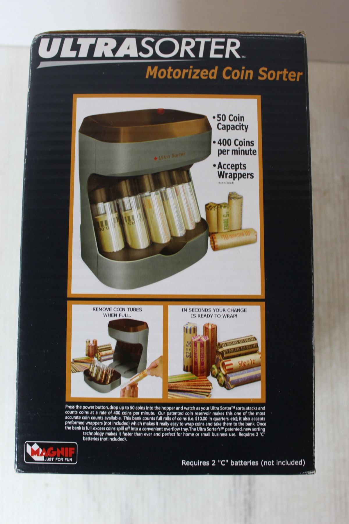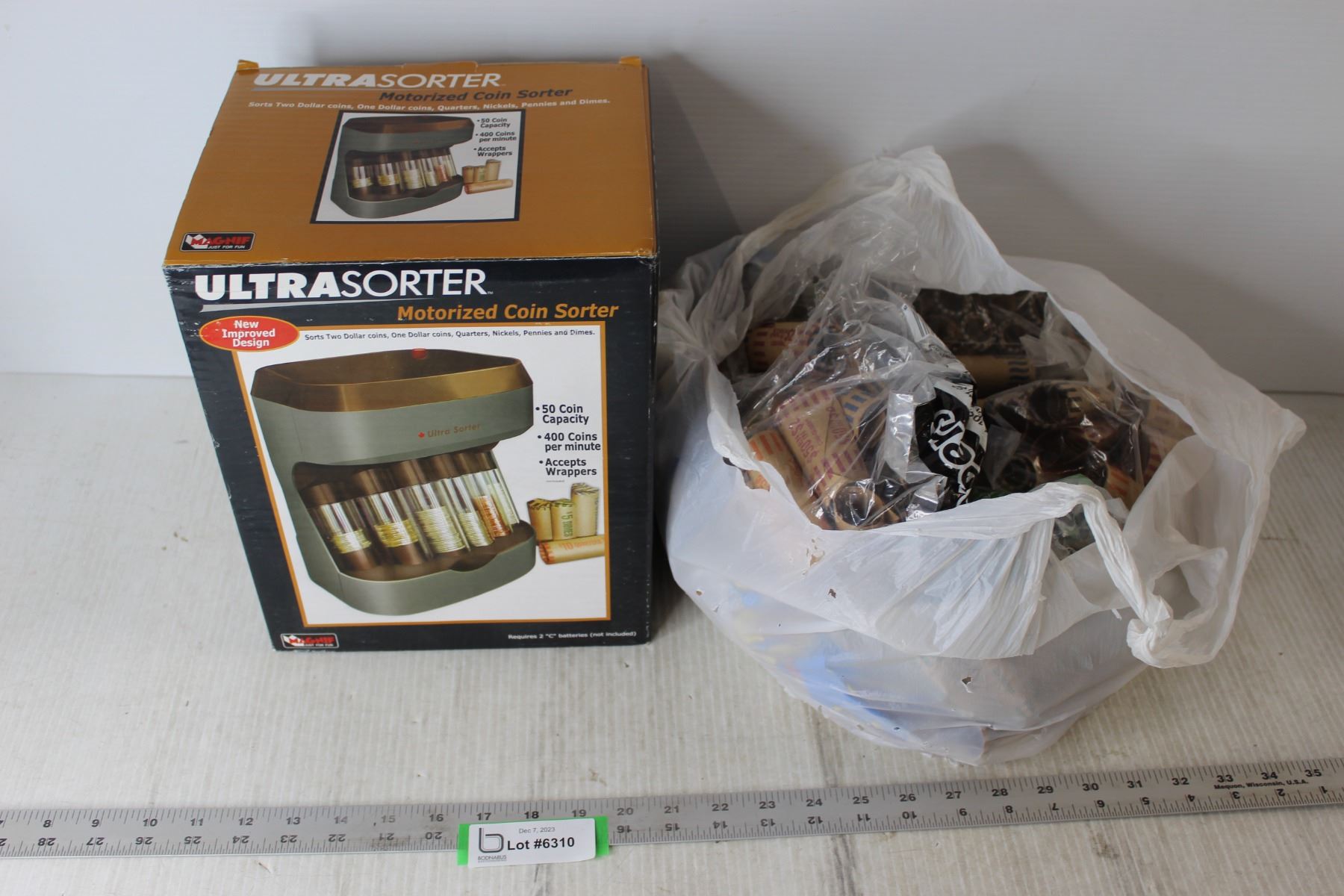 Ultrrasorter Motorized Coin Sorter in Box, Bag of Assorted Coin Wrappers