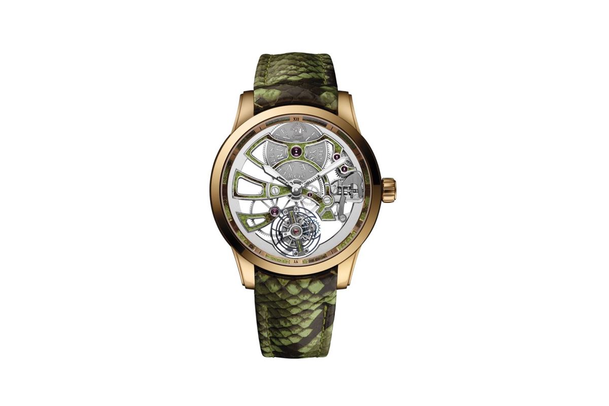 Model: 1706-129/08 - CASE = [Material:18kt Rose Gold with Hand Painted Flange, Motif Royal Python], [Case Diameter:44], [Water Resistant:30 Meters- 100 Feet], [Crystal:Sapphire], DIAL = [Color:Hand Painted Bridges, Motif Royal Python], MOVEMENT = [Type:Manual Winding], BAND = [Clasp:Tang], [Type:Green Alligator Leather], (Usually ships in 1 to 2 weeks.)