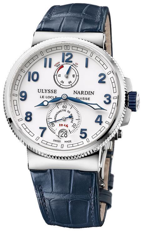 Model: 1183-126/60 - CASE = [Material:Stainless Steel], [Case Diameter:43], [Case Thickness:13.85mm], [Bezel:Fixed Stainless Steel], [Case Back:Transparent], [Water Resistant:100 Meters - 330 Feet], [Crystal:Scratch Resistant Sapphire], DIAL = [Color:White], MOVEMENT = [Type:Automatic Self Winding Chronometer], [Crown:Screw Down], BAND = [Clasp:Push Button Foldover], [Type:Blue Alligator Leather], (Usually ships in 1 to 2 weeks.)