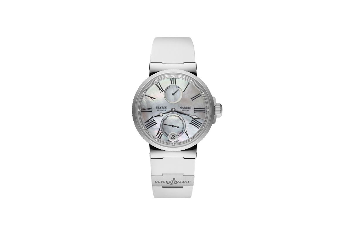 Model: 1183-160-3/40 - Case,; MATERIALSTAINLESS STEEL = [Case Diameter43], [Water Resistant100 Meters- 330 Feet], [CrystalScratch Resistant Sapphire], Dial,; COLORWHITE MOTHER OF PEARL WITH BLACK ROMAN NUMERALS = Movement,; TYPEMANUAL WINDING = [CrownScrew Down], Band,; CLASPFOLDING = [TypeWhite Rubber With Titanium Element], (Usually ships in 1 to 2 weeks.)