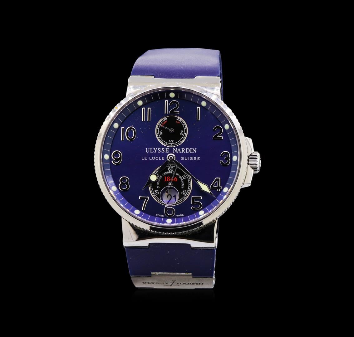 One Ulysse Nardin Maxi Marine watch featuring: Case: Steel. Bezel: Steel. Dial: Blue color; silver tone/luminous hour and minute hands; silver tone hour markers. Features: Date; subsidiary second; power-reserve indicator. Bracelet: Blue rubber strap.