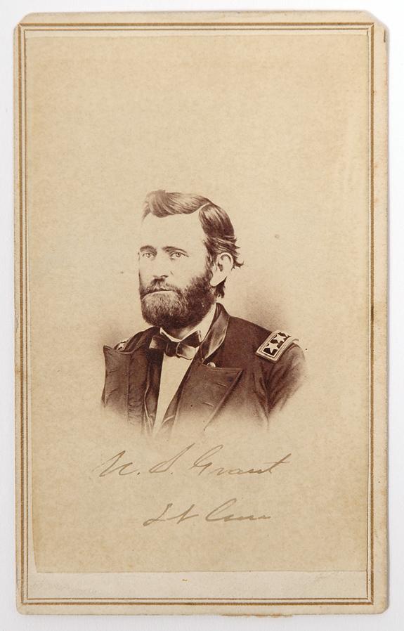 Ulysses S. Grant CDV Signed as Lt. Gen. Carte de visite signed with rank, "U.S. Grant / Lt. Gen." A chest-up portrait of Grant wearing the three stars that signified his rank as lieutenant general, a rank bestowed on Grant by Abraham Lincoln on March 9, 1864. Not since George Washington had an American general been raised to that rank. In July 1977, the late autograph dealer Charles Hamilton wrote in pencil on the verso a certification that the name and rank are in Grant's hand. Fine condition; minor creasing at lower edge of mount and small indentation at top. A rare Grant CDV signed as Lt. Gen.