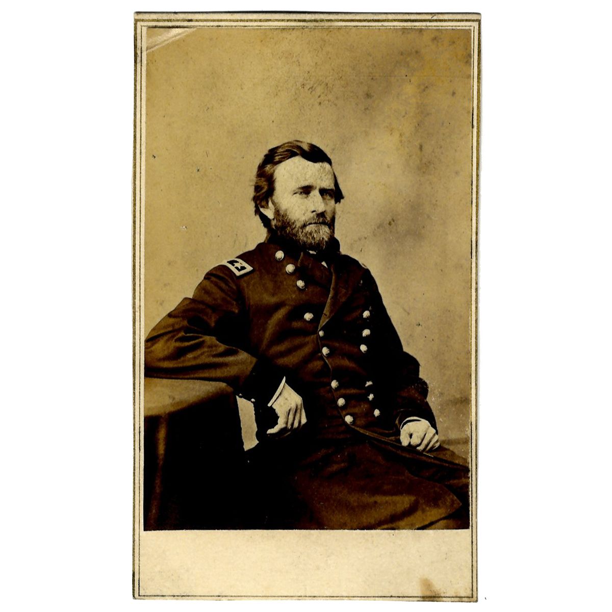 CDV of General Ulysses S. Grant, shown seated in his Civil War uniform. Sepia photograph was taken by Mathew Brady and later reproduced by E. & H.T. Anthony. With backmark reading, ''Published by E. & H.T. Anthony, 501 Broadway, New York from Photographic Negative in Brady's National Portrait Gallery''. Measures 2.25'' x 4''. Top left corner of albumen print slightly detached from card. Light soiling and toning, else near fine.