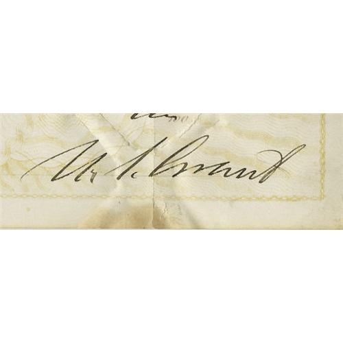 <B> Ulysses S. Grant Check Signed </B></I> "<I>U.S. Grant.</B></I>" 8.3" x 3" check, First National Bank of Washington D.C., dated April 14, 1869, for $206.09. This check was signed while he was serving as President of the United States. An interesting bit of trivia about this president: he is the only president ever to receive a speeding ticket for running his horse and buggy through the streets of Washington, D.C. <BR><BR> The check is in very good condition; staining from exposure to moisture or light is present on the upper and right edges; small tear and fold on the lower right portion of the check; cancellation mark has slightly dented the signature.
