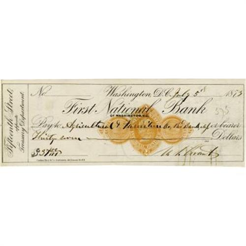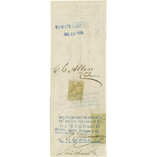 <B>Ulysses S. Grant Check Signed as President</B></I> A check, 7.75" x 2.75", drawn on the First National Bank of Washington D.C., July 5, 1873; made out to "<I>Agricultural & Furniture Co., Red Bank, N.Y.</B></I>" in the amount of thirty-seven dollars. Cancellation cut through Grant's signature and spindle tears occurring at center have been mended on verso, otherwise very clean and ideal for display.<BR><BR><b>Shipping:</b> Flat Material, Small (<a target="_blank" href="http://www.heritageauctions.com/common/shipping.php">view shipping information</a>)