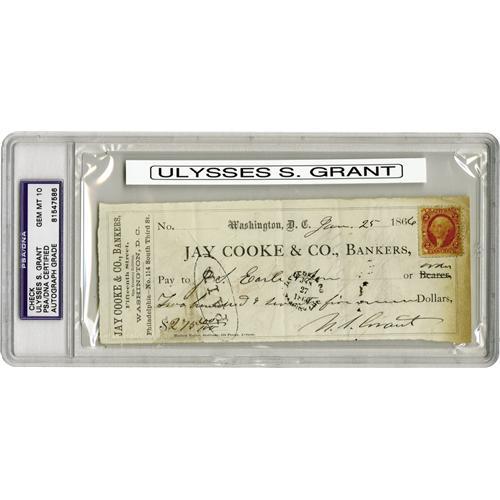 <B>Ulysses S. Grant Check Signed,</B></I> "<I>U.S. Grant</B></I>", 2.75" x 7", Washington, D.C., January 25, 1866. Drawn for $275 on the bank of Jay Cook & Co. and payable to "<I>J.S. Earle & Son</B></I>". Four endorsement signatures on verso; 2-cent revenue stamp and hand cancels on the face. Browning to right edge, small areas of staining. The general's signature is bold and free from defects. Overall very good condition. <BR><BR><B>Important notice:<