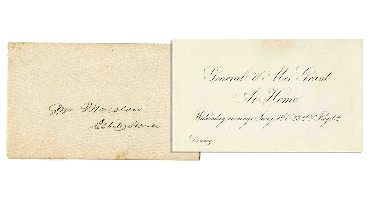 Ulysses S. Grant dinner invitation addressed to New Hampshire Senator, General Gilman Marston. Printed invitation in elegant script reads: ''General & Mrs. Grant, At Home / Wednesday evenings Jany. 9th & 23rd & Feby. 6th / Dancing''. Includes original envelope addressed to ''Mr. Marston / Ebbitt House'' with an embossed ''G'' on the verso of the envelope. Invitation measures 5'' x 3'' with toning throughout. Near fine condition.