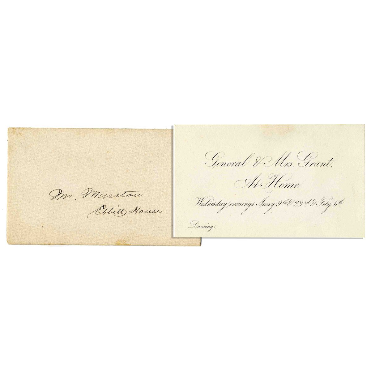 Ulysses S. Grant dinner invitation addressed to New Hampshire Senator, General Gilman Marston. Printed invitation in elegant script reads: ''General & Mrs. Grant, At Home / Wednesday evenings Jany. 9th & 23rd & Feby. 6th / Dancing''. Includes original envelope addressed to ''Mr. Marston / Ebbitt House'' with an embossed ''G'' on the verso of the envelope. Invitation measures 5'' x 3'' with toning throughout. Near fine condition.