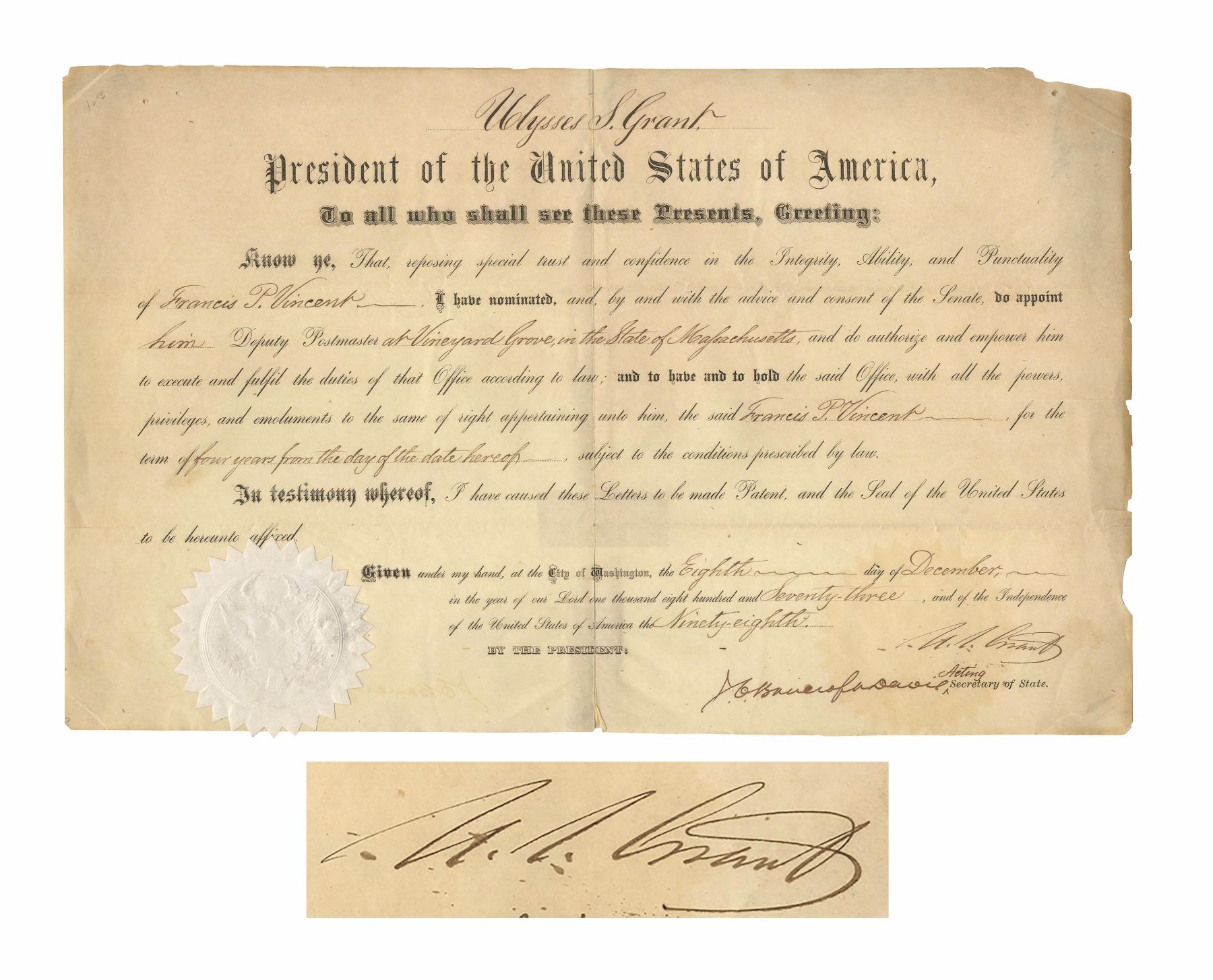 Attractive document signed by Ulysses S. Grant as President, appointing Francis Vincent as Deputy Postmaster of Vineyard Grove, Massachusetts. Signed ''U.S. Grant'' on 8 December 1873. With intact white Great Seal at lower left. Measures 16.5'' x 10.5''. Archival repair to paper's verso and chipping along edges. Overall in very good condition.