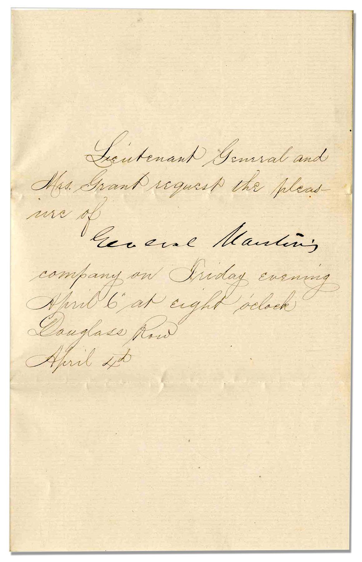 Ulysses S. Grant dinner invitation addressed to New Hampshire Senator, General Gilman Marston. Handwritten invitation reads: ''Lieutenant General and Mrs. Grant request the pleasure of General Marstin's [sic] company on Friday evening April 6 at eight o'clock / Douglas Row / April 4th''. After the Civil War, Grant had a home on Douglas Row, an elite section of Washington D.C. Letter measures 4.5'' x 7'' with a blank integral leaf. Near fine condition.