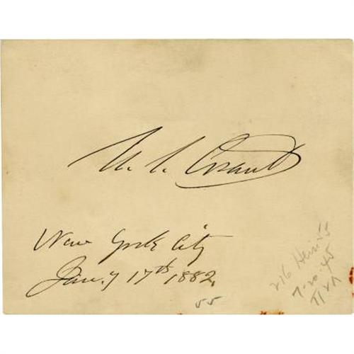 <B>Ulysses S. Grant Signature</B></I> “<I> U. S. Grant</B></I>”. 4.5” x 3.5”, on autograph card, New York City, January 17, 1882, card toned with mounting remnants on verso, else a strong, bold signature in very good condition. <I>Ex. Henry E. Luhrs Collection.</B></I> <BR><BR><b>Shipping:</b> Flat Material, Small (<a target="_blank" href="http://www.heritageauctions.com/common/shipping.php">view shipping information</a>)