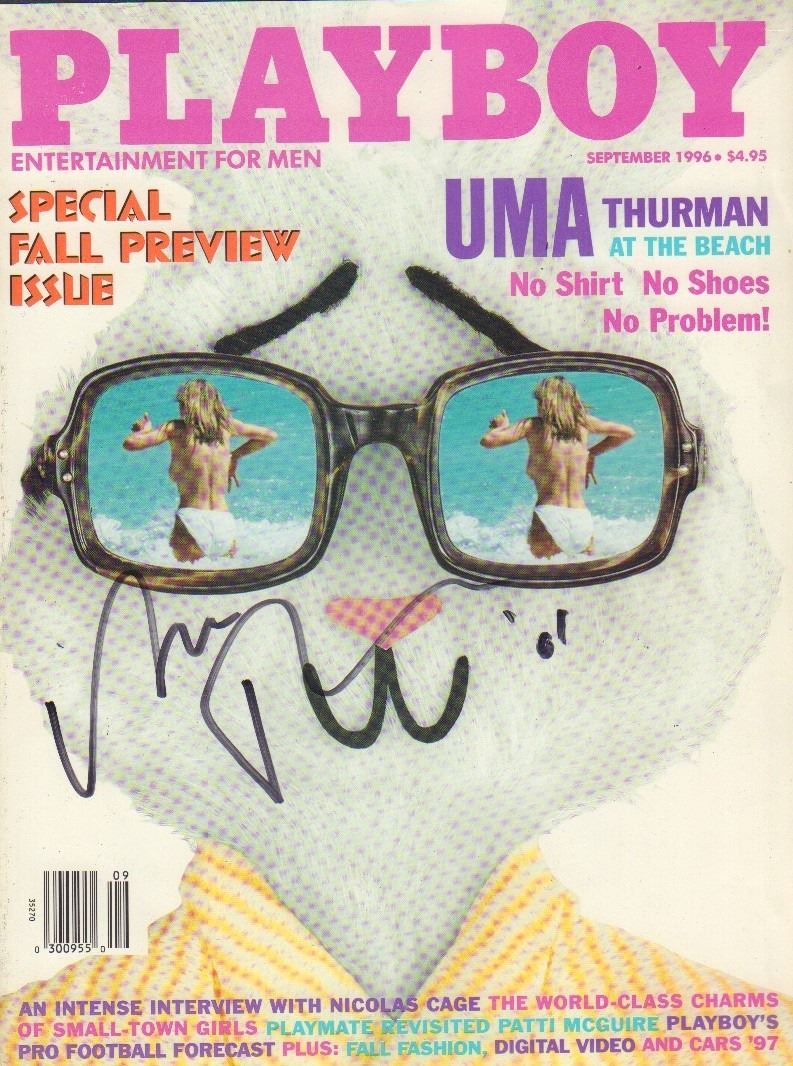 September 1996 Playboy Magazine cover signed by Uma Thurman. This item is in good condition with no rips or tears and comes with a certificate of authenticity from Piece of the Past that is good for the life of the piece.