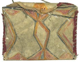 Very rare, hard rawhide medicine case with mineral painted designs. 12" x 10"