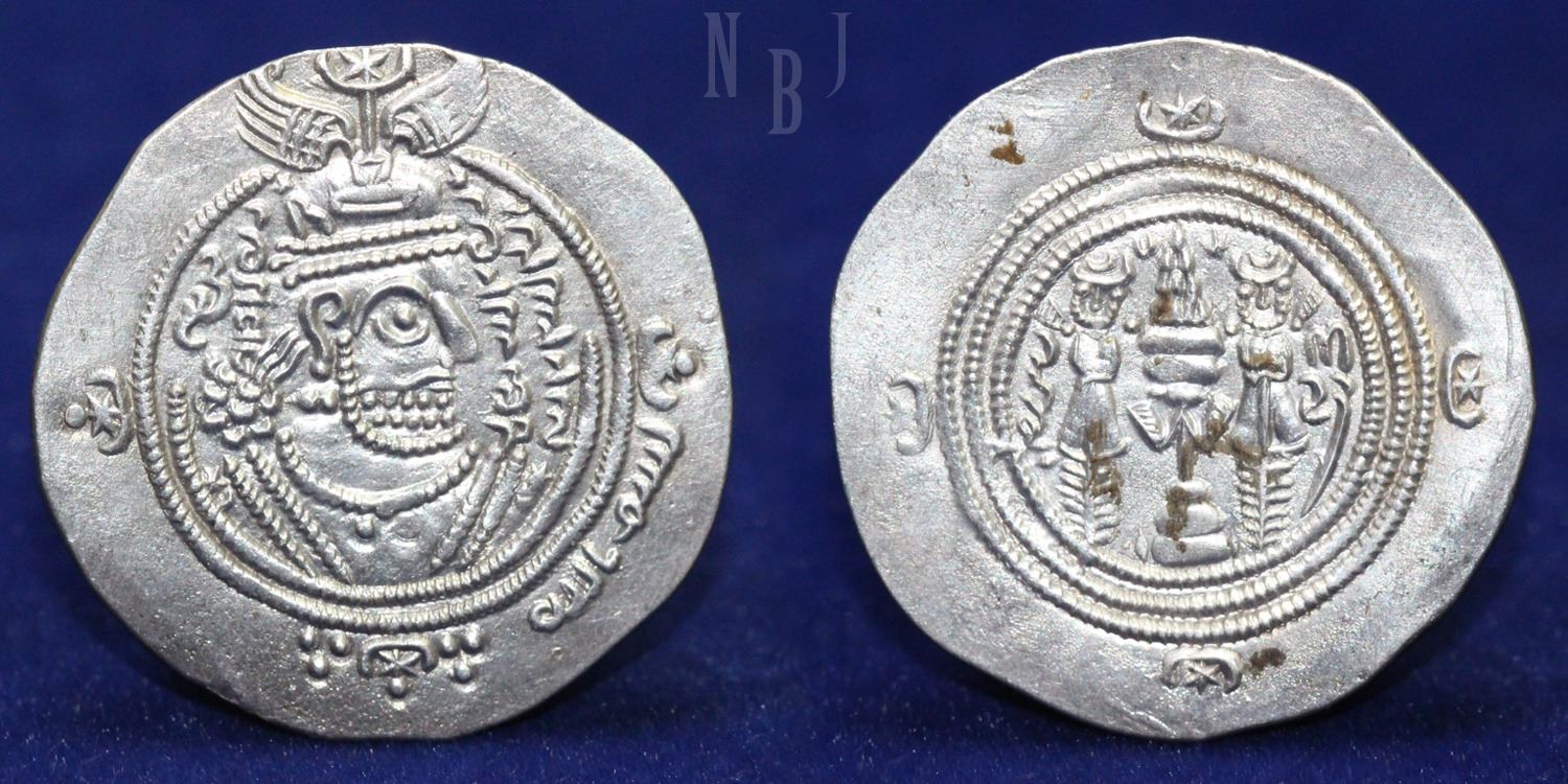 ISLAMIC, Umayyad Caliphate: 'Abd Allah ibn al-Zubayr, rival caliph, AH 60-73 / AD 680-692. AR Dirham. Arab-Sasanian type, citing the rival caliph 'Abd Allah ibn al-Zubayr as Amir, DA + P (Fasa), year 60. Draped bust resembling Khosrau II to right, wearing elaborate mural crown; behind head, AFZUT GDH ('may his kingship increase' in Pahlawi); before head, in outer margin, 'bism Allah' ('In the name of Allah') and three pellets to left and right of one star-in-crescent. Fire altar with ribbons flanked by two attendants; in upper right field, six-pointed star; in upper left field, crescent; to left, date; to right, DA + P (name of the mint in Pahlawi), 4.12gm, 29mm, Very Rare. Extremely Fine.