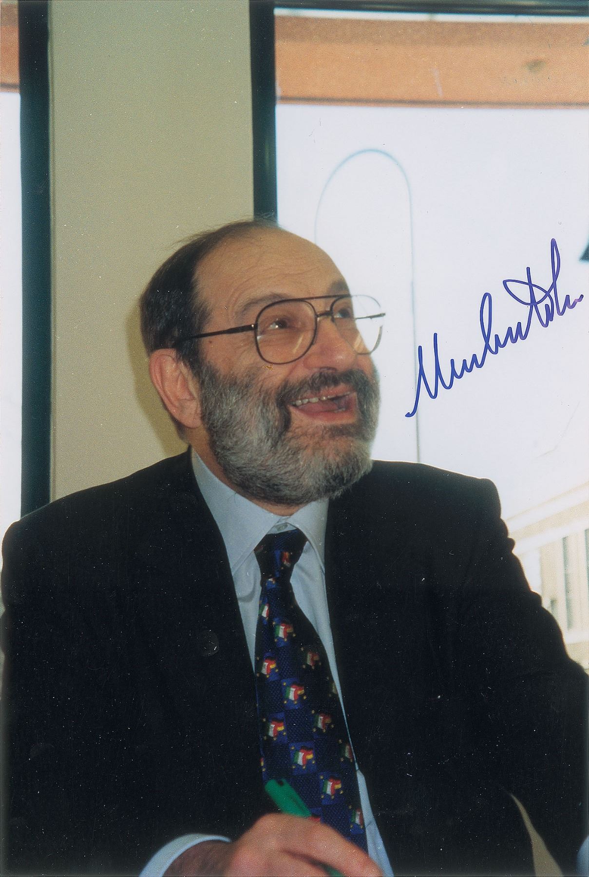 Italian novelist and literary critic (1932–2016) who is best known for his novels The Name of the Rose, Foucault's Pendulum, The Island of the Day Before, and The Prague Cemetery. Color glossy 8 x 11.75 photo of Eco in a cheerful half-length pose, signed in blue felt tip. In fine condition.