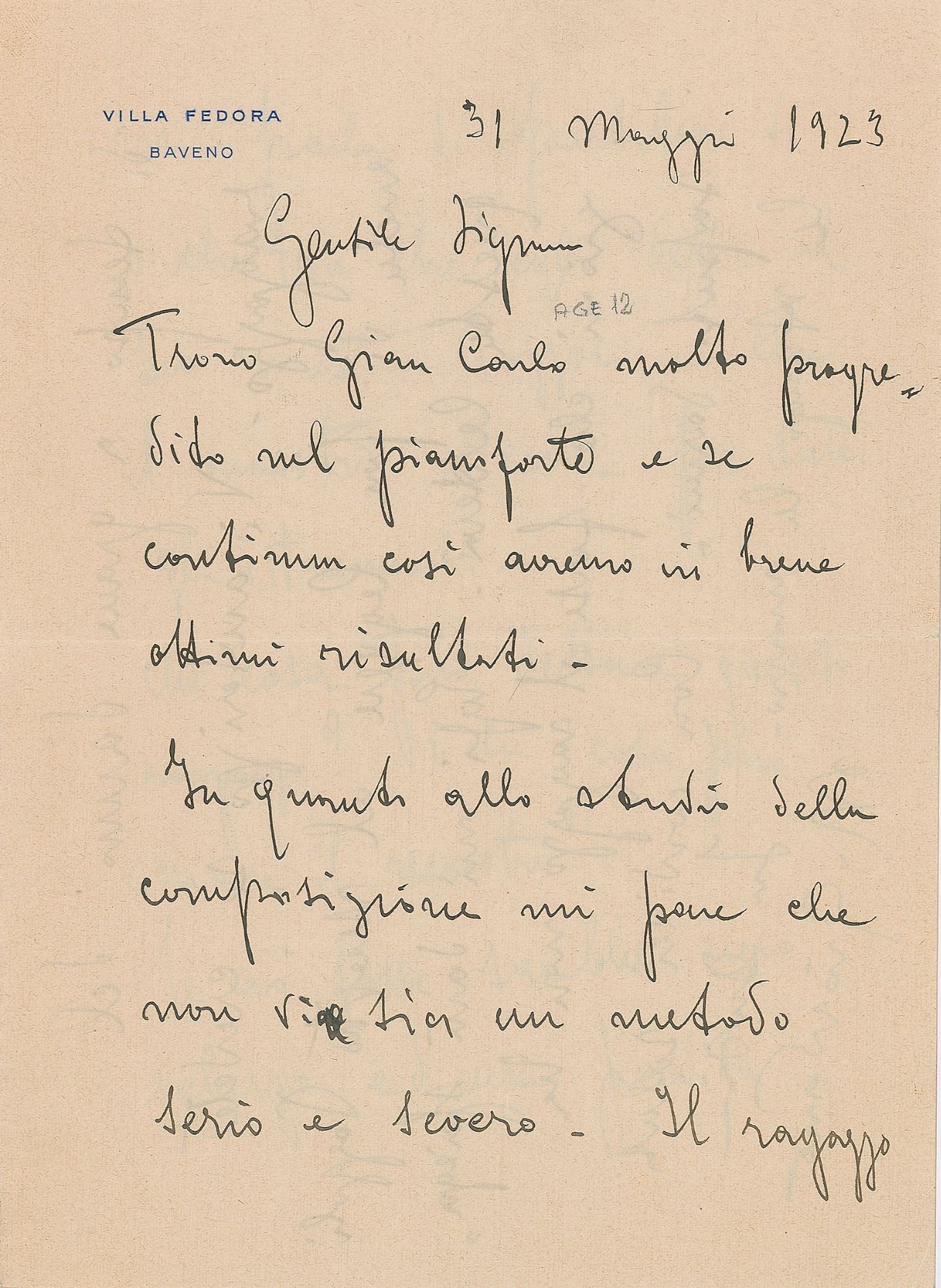 Italian opera composer (1867–1948) in the verismo, or 'realist,' style, known for his opera Andrea Chénier. Untranslated ALS in Italian, signed “M. Giordano,” three pages on two adjoining sheets, 6 x 8.25, Villa Fedora letterhead, May 31, 1923. Letter to the mother of Gian Carlo Menotti, regarding the advancement in Menotti's musical studies at the age of 12. In fine condition. The Umberto Giordano Festival was started on the occasion of the centenary of the first performance of the composer’s 1898 opera Fedora, and the 50th anniversary of the composer’s death in 1948. It originated as an event devoted to musicians and composers of the 19th and 20th centuries, but was later extended to include all the musical genres of the last century. It is held every July in Baveno, where the composer spent lengthy periods on holiday and at work in his superb Villa Fedora.