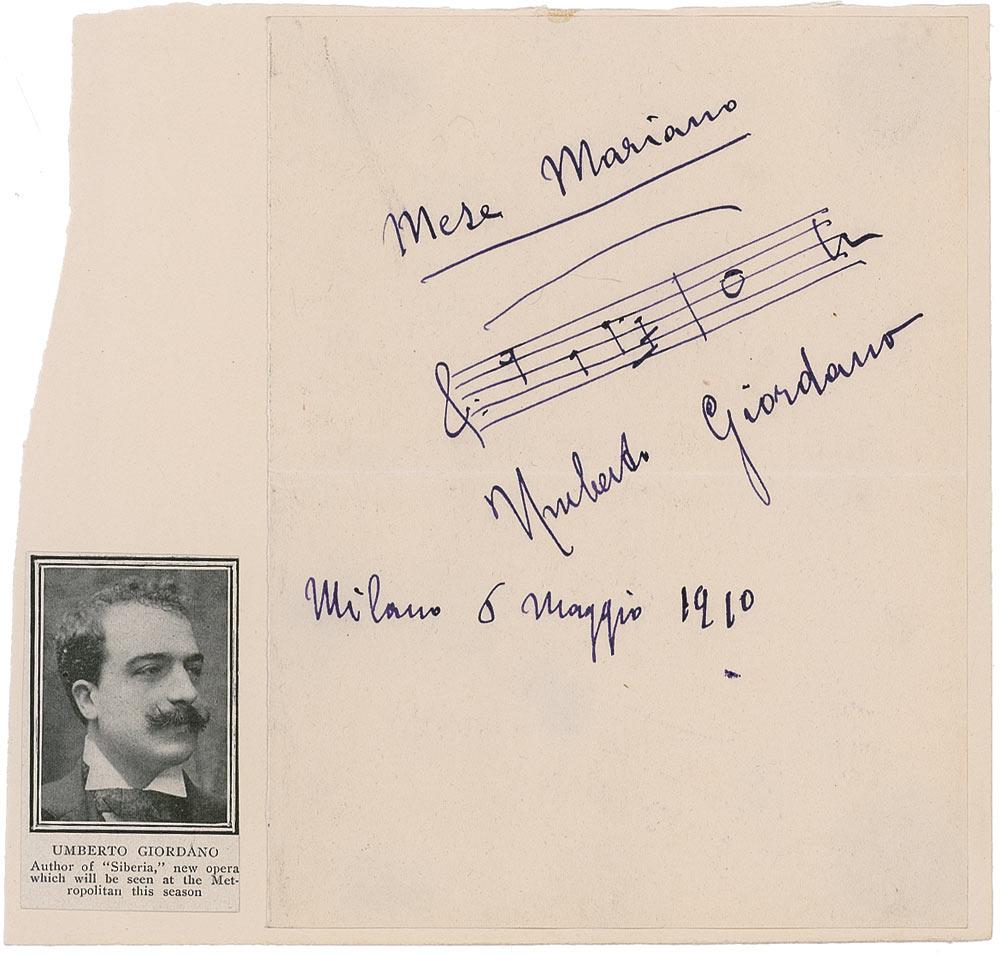 Italian composer. AMQS on an off-white 5 x 6.5 album page, Giordano pens two bars from his opera Mese Mariano, signing underneath, “Umberto Giordano, Milano 6 Maggio 1910.” In fine condition, with light crease through portion of first name and page mounted to a slightly larger sheet. RRAuction COA.