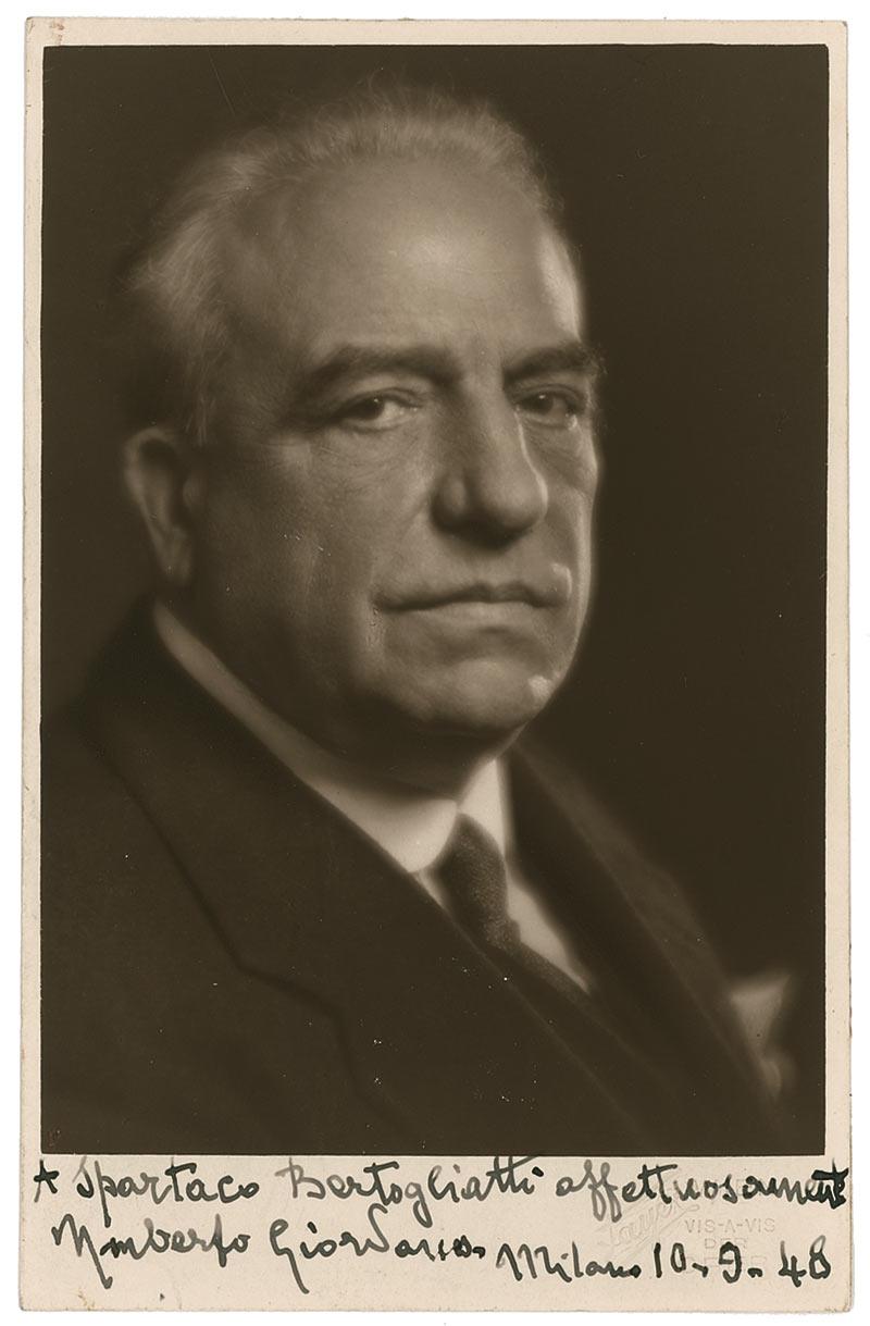 Italian composer. Vintage 3.25 x 5 head-and-shoulders postcard photo, signed and inscribed in fountain pen in Italian in the lower border and dated September 10, 1948. In fine condition.