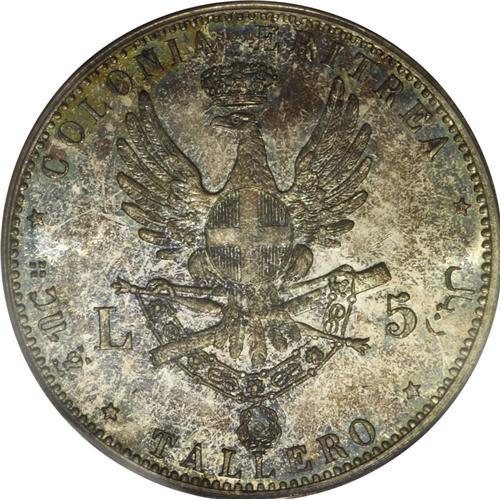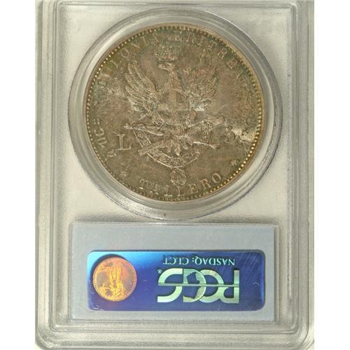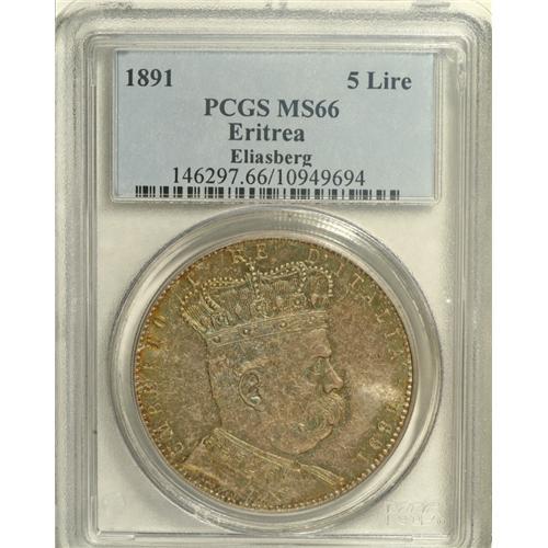 <B>Umberto I 5 Lire 1891, </B></I>KM4, MS66 PCGS Eliasberg, a truly magnificent coin with glowing gold and gray toning over fully brilliant surfaces. This is a coin with immediate eye appeal and is certainly one of the finest known for the type.<BR><I>From the Louis E. Eliasberg, Sr. Collection</B></I><BR><BR><b>Shipping:</b> Coin/Currency (<a target="_blank" href="http://www.heritageauctions.com/common/shipping.php">view shipping information</a>)