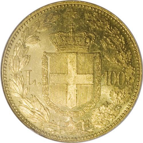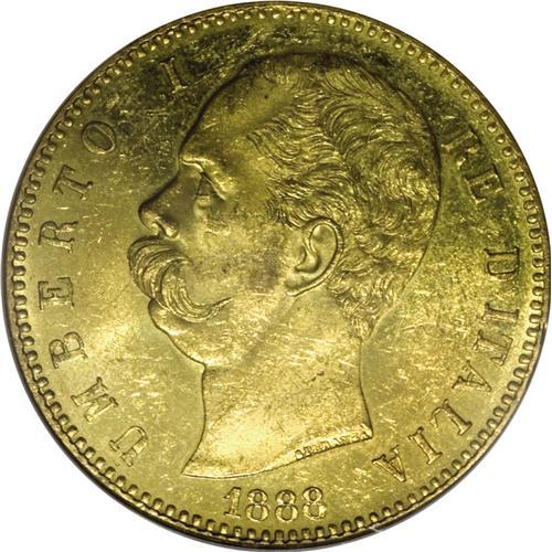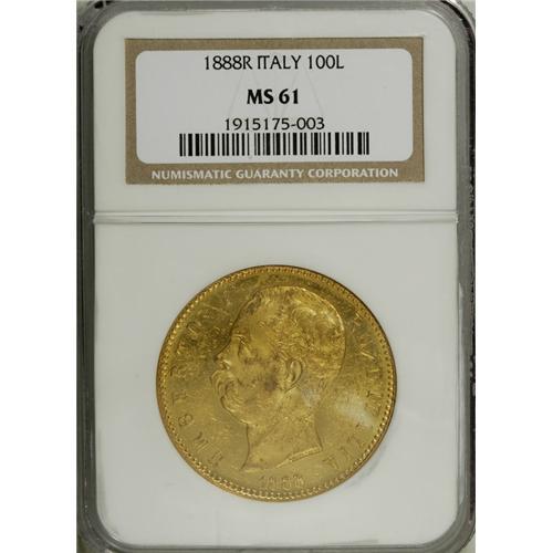 <B>Umberto I gold 100-Lire 1888-R,</B></I> KM-22, MS61 NGC, prooflike, and despite the many small abrasions this is a real beauty among Italian gold pieces of this size. Impressive! Rare. The mintage was a mere 1,169 coins. How many remain as fine as this one? Very few indeed.<BR><BR><b>Shipping:</b> Coin/Currency (<a target="_blank" href="http://www.heritageauctions.com/common/shipping.php">view shipping information</a>)