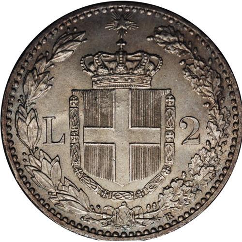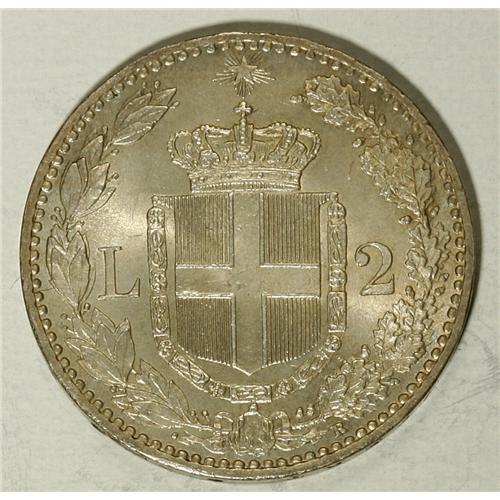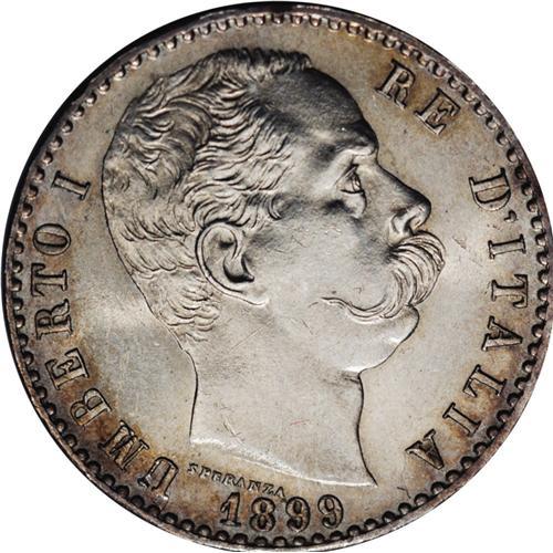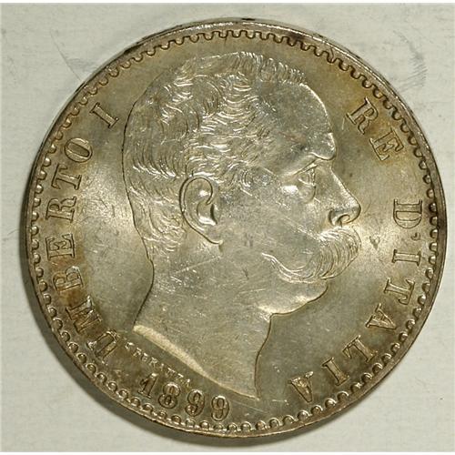 <B>Umberto I silver 2-Lire 1899-R,</B></I> KM-23, Choice UNC, soft satiny luster, golden silvery hues, sharply struck. The die-tooling work can even be seen under a glass! An excellent piece, rare thus.<BR><BR><b>Shipping:</b> Coin/Currency (<a target="_blank" href="http://www.heritageauctions.com/common/shipping.php">view shipping information</a>)