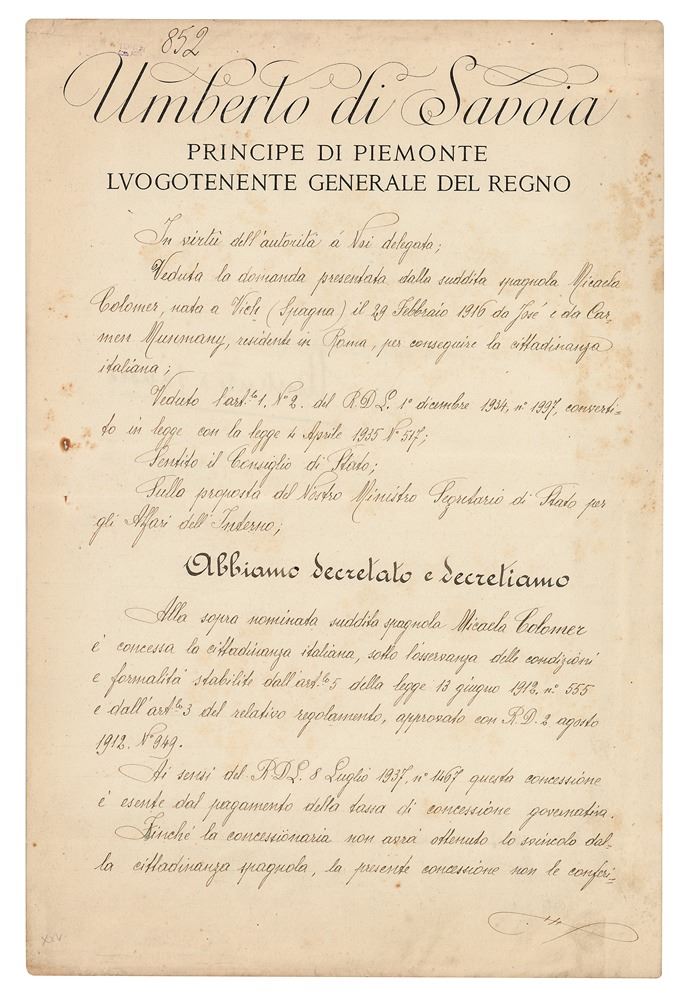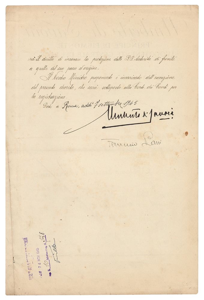 Manuscript DS in Italian, signed "Umberto di Savoia," one page both sides, 9.5 x 14.25, September 7, 1945. Untranslated official document boldly signed at the conclusion by Umberto II. In fine condition, with light scattered foxing and creasing.