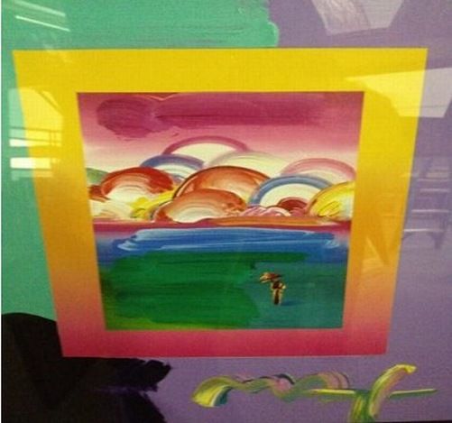 "Umbrella Man W/ Rainbow Sky" Peter Max Original Mixed Media - Professionally Framed & Matted - Hand Signed And Embellished By Peter Max - Authenticated With Max Gallery Copyright Stamp And Serial Number On The Back - Paper 10" X 12.5"