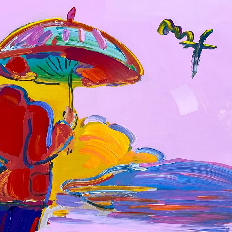 "Umbrella Man at Sea" is a one-of-a-kind acrylic mixed media on paper, hand signed by Peter Max. The piece comes custom framed with a backside cutout to display Peter Max Studio registration number 243208 certifying authenticity. Measures approx. 36.5" x 48.5" (frame), 24" x 36" (image).