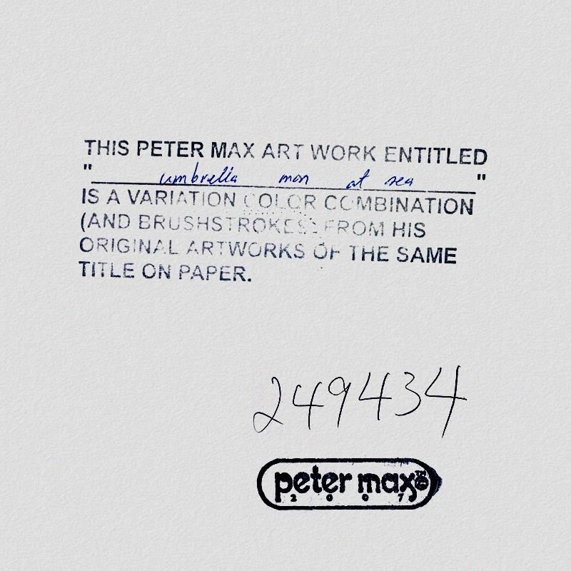 "Umbrella Man at Sea" is a one-of-a-kind mixed media on paper, hand signed by Peter Max. The piece comes custom framed with a backside cutout to display Peter Max Studio registration number 249434 certifying authenticity. Measures approximately 30" x 42" (frame), 24" x 36" (image). This item requires special handling and may have a longer than usual turnaround.