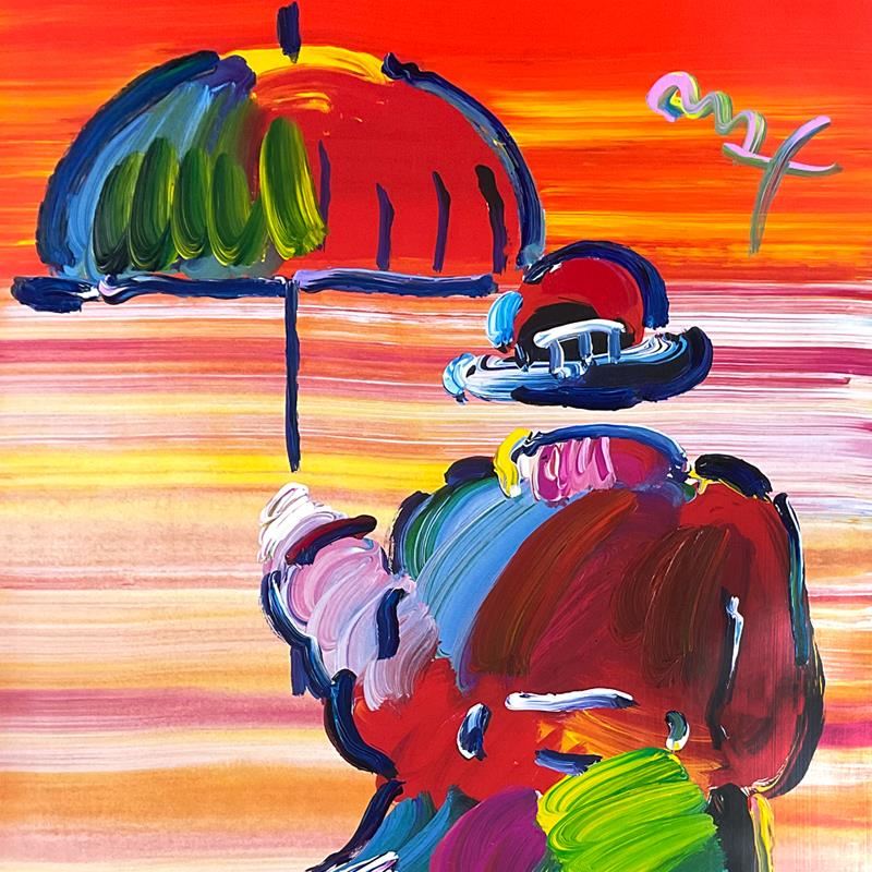 "Umbrella Man" is a one-of-a-kind acrylic mixed media on paper, hand signed by Peter Max. The piece comes custom framed with a backside cutout to display Peter Max Studio registration number 252052 certifying authenticity. Measures approx. 44.5" x 36.5" (frame), 31" x 23" (image).