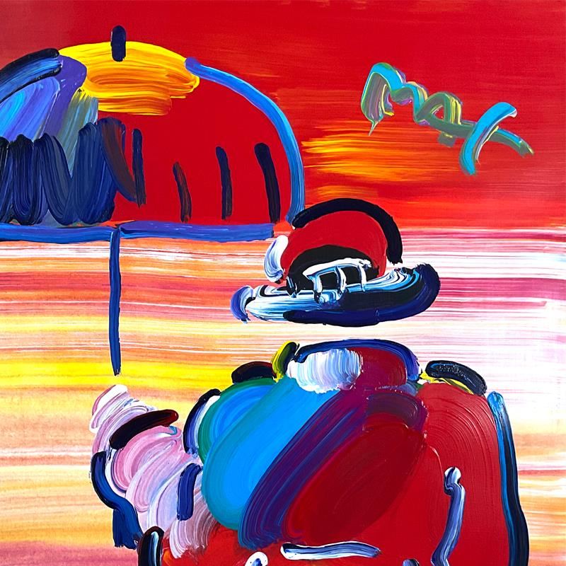 "Umbrella Man" is a one-of-a-kind acrylic mixed media on paper, hand signed by Peter Max. The piece comes custom framed with a backside cutout to display Peter Max Studio registration number 254518 certifying authenticity. Measures approx. 44.5" x 36.5" (frame), 31" x 23" (image).