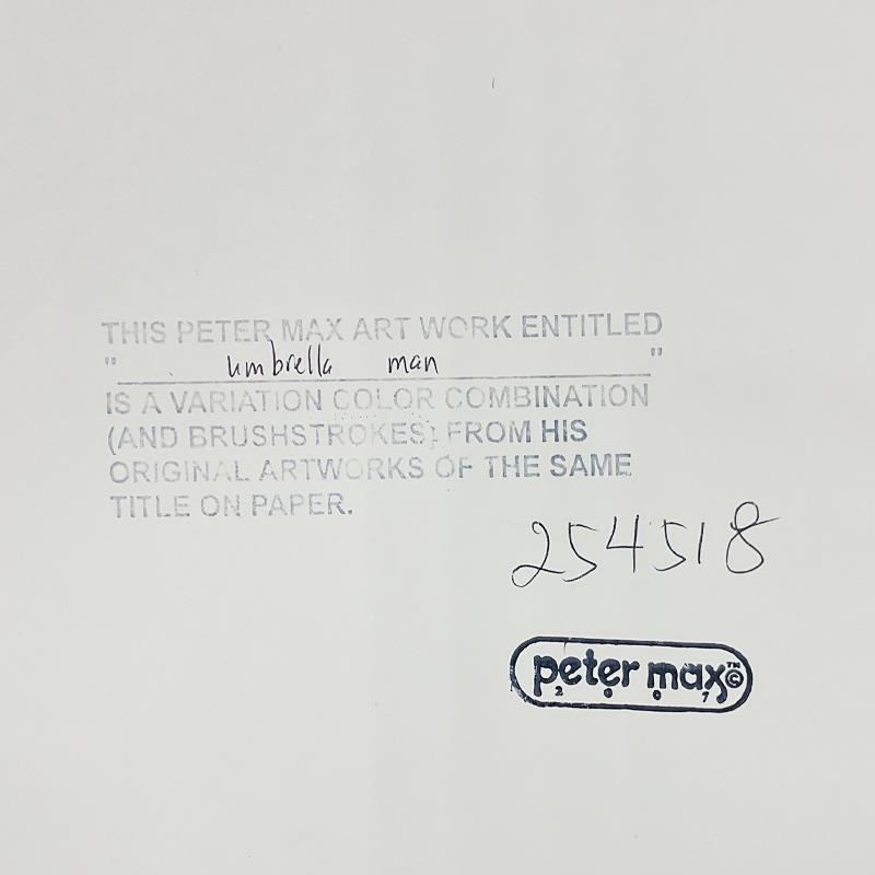 "Umbrella Man" is a one-of-a-kind acrylic mixed media on paper, hand signed by Peter Max. The piece comes custom framed with a backside cutout to display Peter Max Studio registration number 254518 certifying authenticity. Measures approx. 44.5" x 36.5" (frame), 31" x 23" (image).