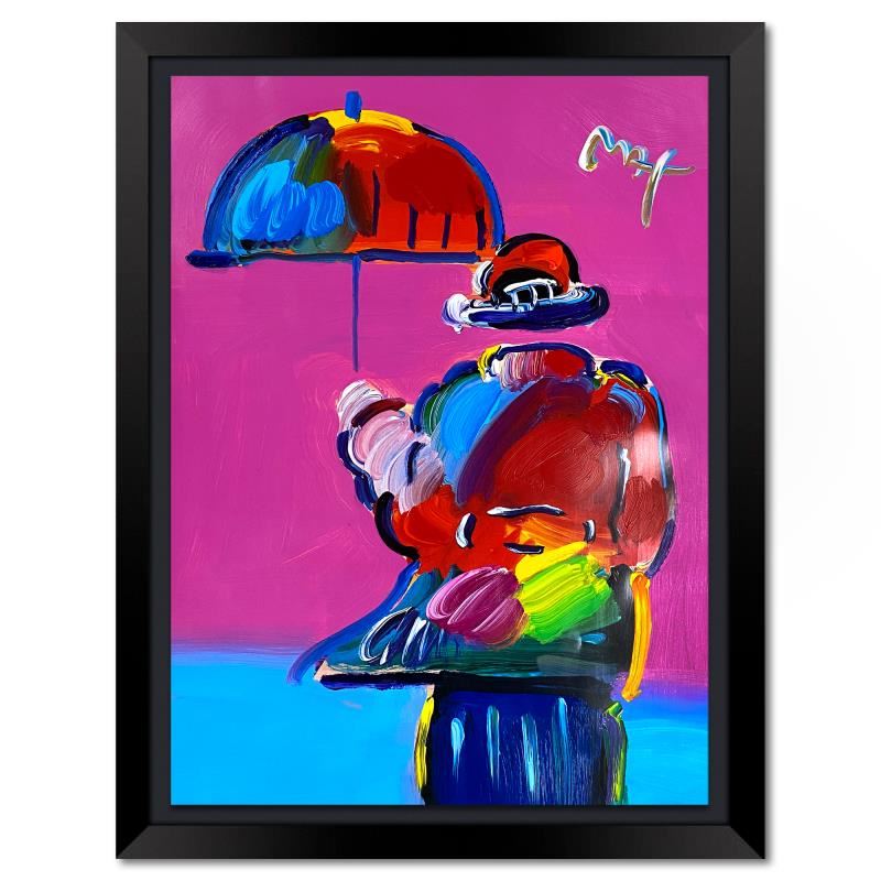 "Umbrella Man" is a one-of-a-kind mixed media on paper, hand signed by Peter Max. The piece comes custom framed with a backside cutout to display Peter Max Studio registration number 252302 certifying authenticity. Measures approximately 38.5" x 30" (frame), 32.5" x 24" (image).