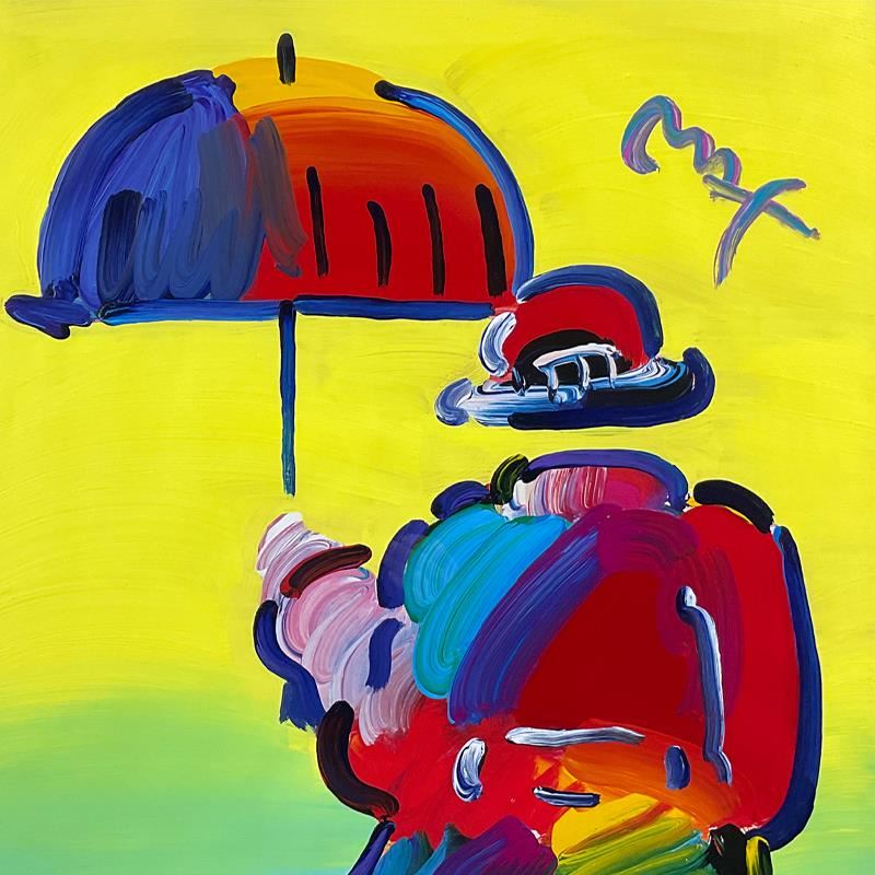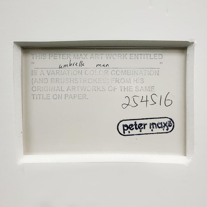 "Umbrella Man" is a one-of-a-kind acrylic mixed media on paper, hand signed by Peter Max. The piece comes custom framed with a backside cutout to display Peter Max Studio registration number 254516 certifying authenticity. Measures approx. 38.5" x 30" (frame), 31" x 23" (image). This item requires special handling and may have a longer than usual turnaround.